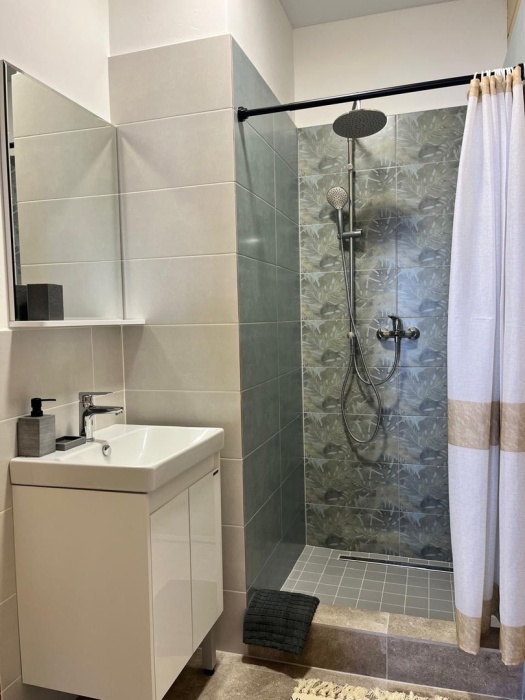 Рядом полностью оборудованный пляж - кристально чистая вода, мелкая галька с песком, кафе и рестораны, различные развлечения для детей, кабинки для переодевания, а также возможность взять в прокат шезлонги и беседки.