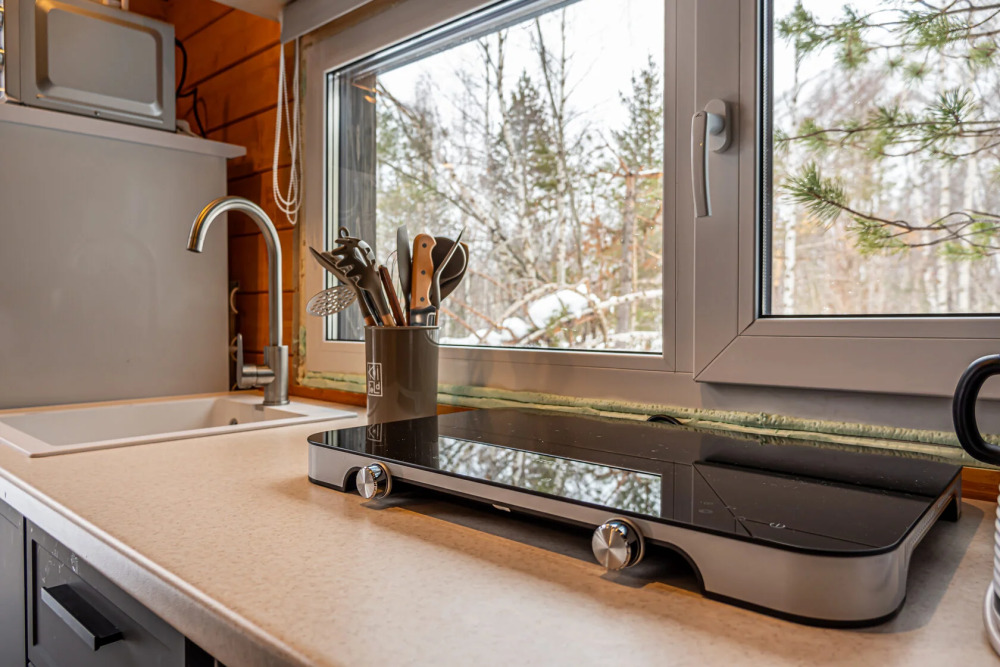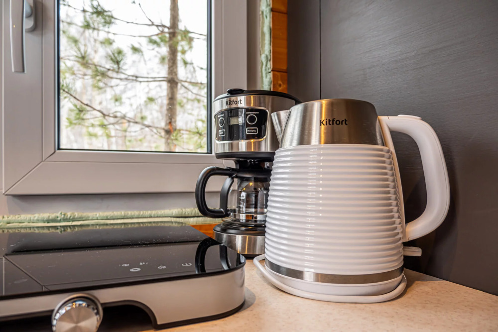 Собственная кухня: холодильник, плита, посуда, микроволновка, электрический чайник, кофеварка, чай, кофе, сахар.
