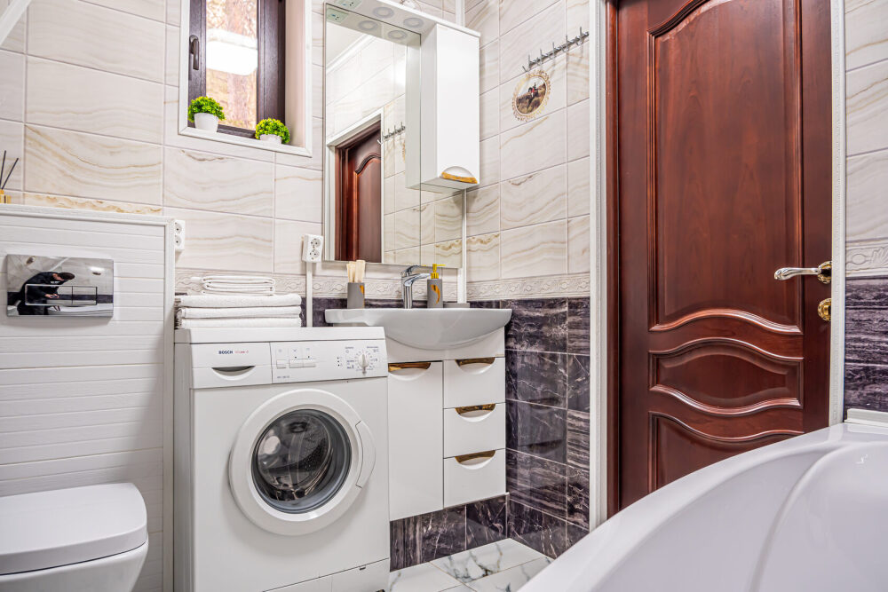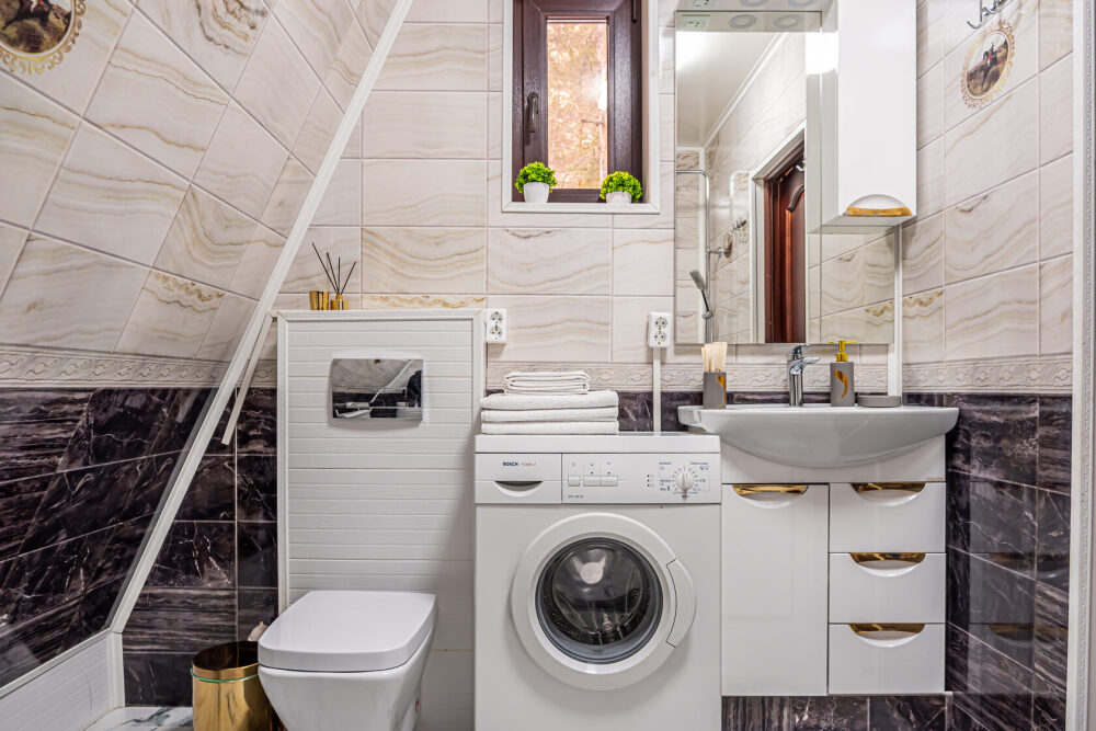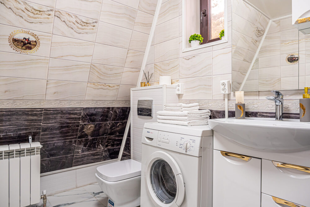 - Ванная с душем, стиральная машина, фен, утюг, гладильная доска, тапочки, сушилка, шампунь, мыло.