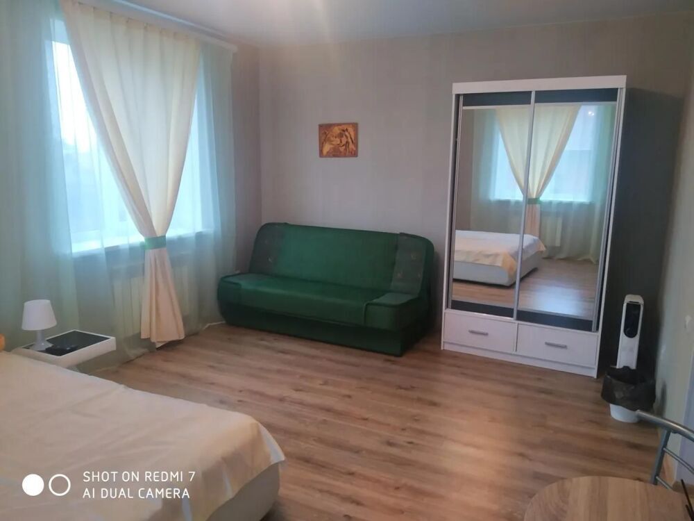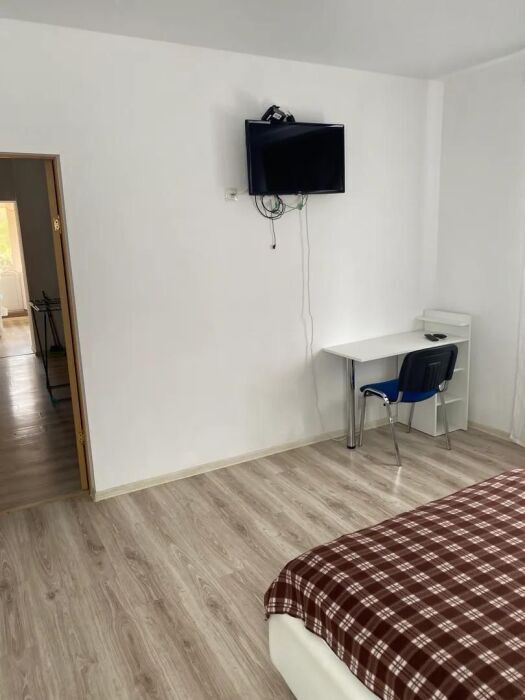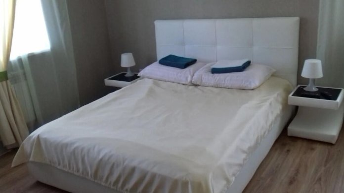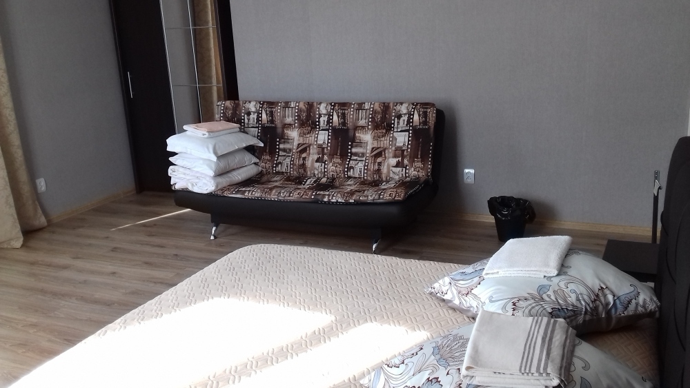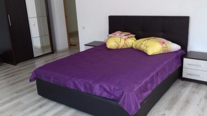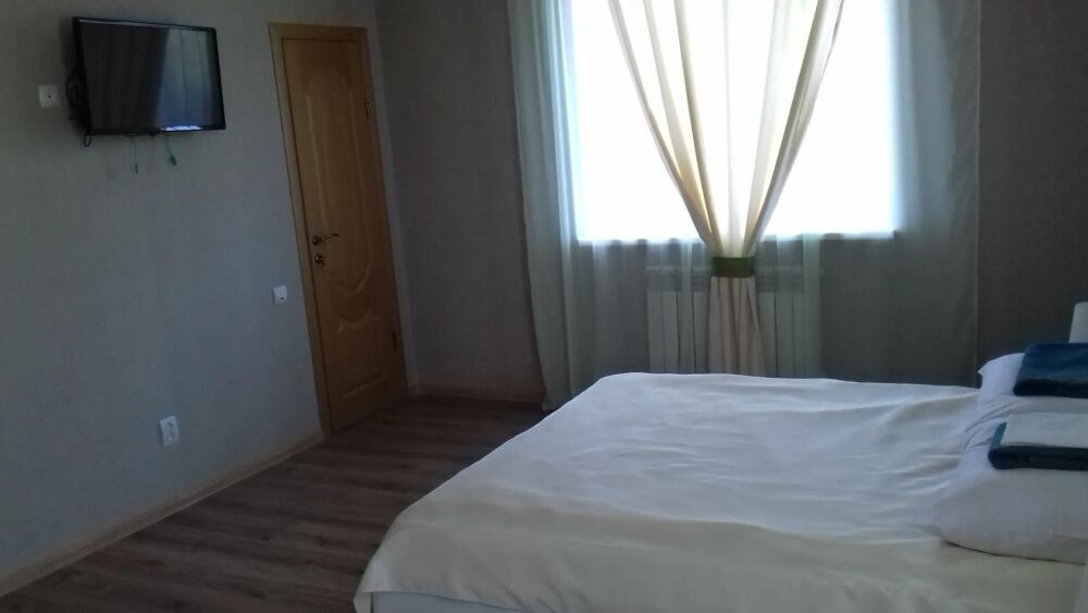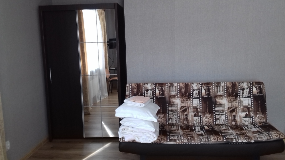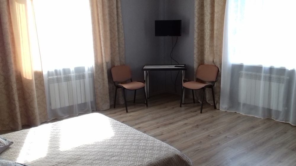 Номер находится на первом этаже. В номере большая двуспальная кровать (1,6*2,0) с прикроватными тумбочками, шкаф, журнальный столик, маникюрный столик. Диван-кровать (7*1,55) для проживания ребенка, телевизор. На этаже есть ещё два номера, общая кухня с балконом и два санузла.