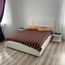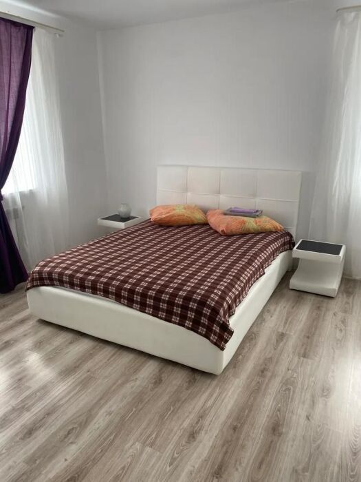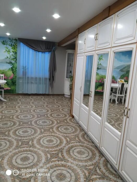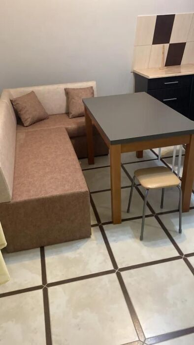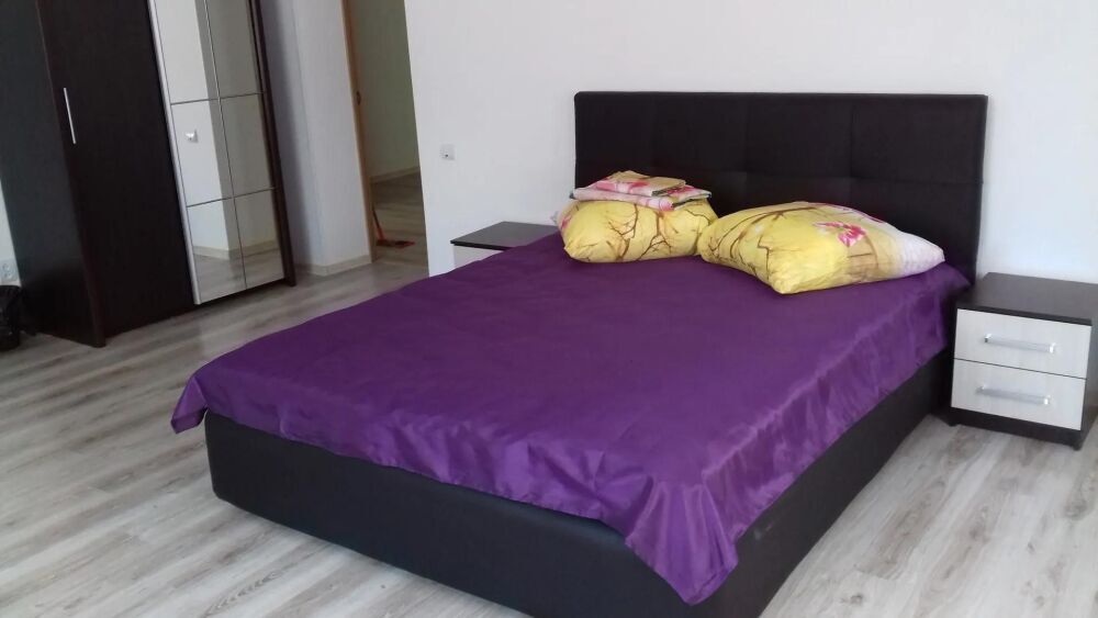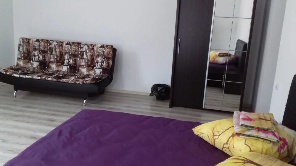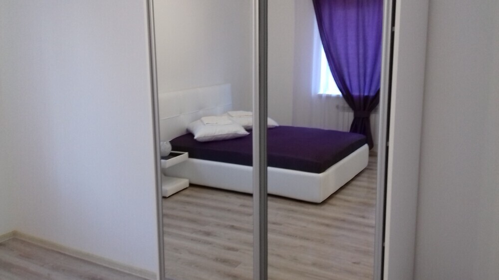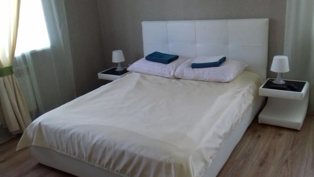 Номер находится на первом этаже. В номере большая двуспальная кровать (1,6*2,0) с прикроватными тумбочками, шкаф, журнальный столик, маникюрный столик. Диван-кровать (7*1,55) для проживания ребенка, телевизор. На этаже есть ещё два номера, общая кухня с балконом и два санузла.