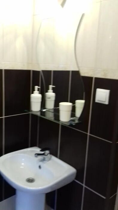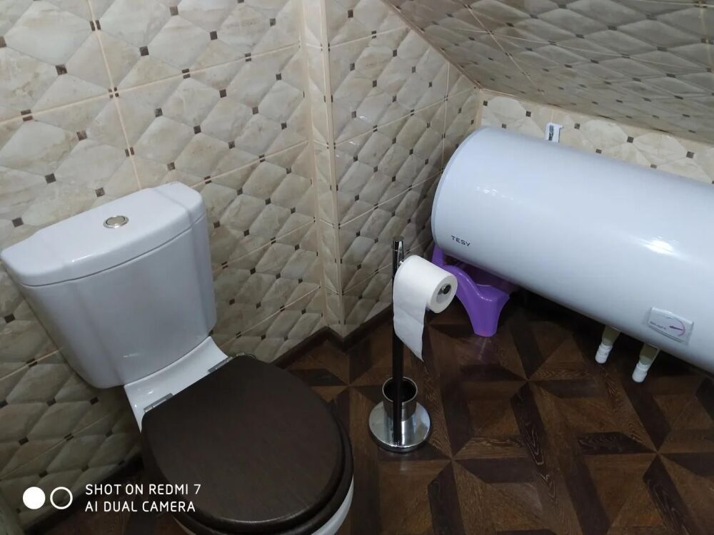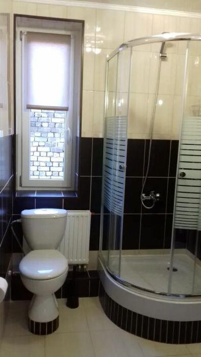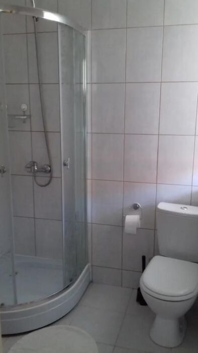 Номер с собственным с/у (душевая кабина, унитаз, раковина). В номере одна двуспальная кровать, диван-кровать, телевизор, тумбы, столик со стульями, шкаф-купе. На этаже можно воспользоваться общей (на три номера) кухней с балконом.