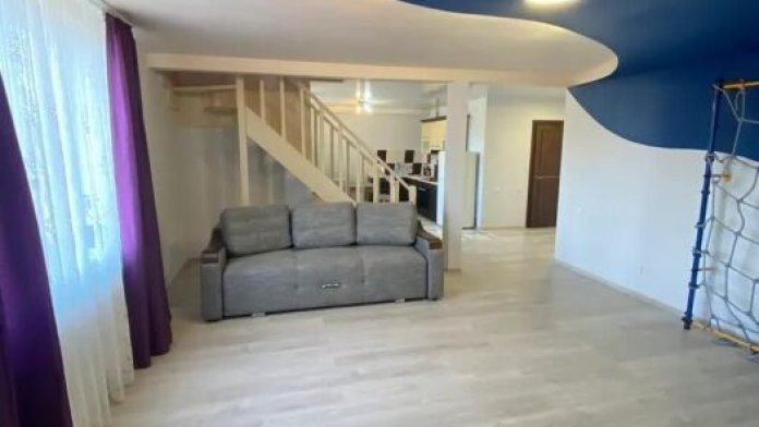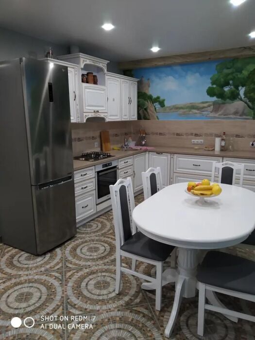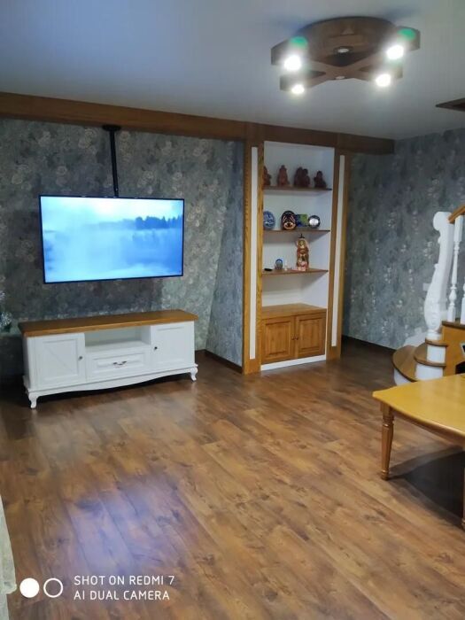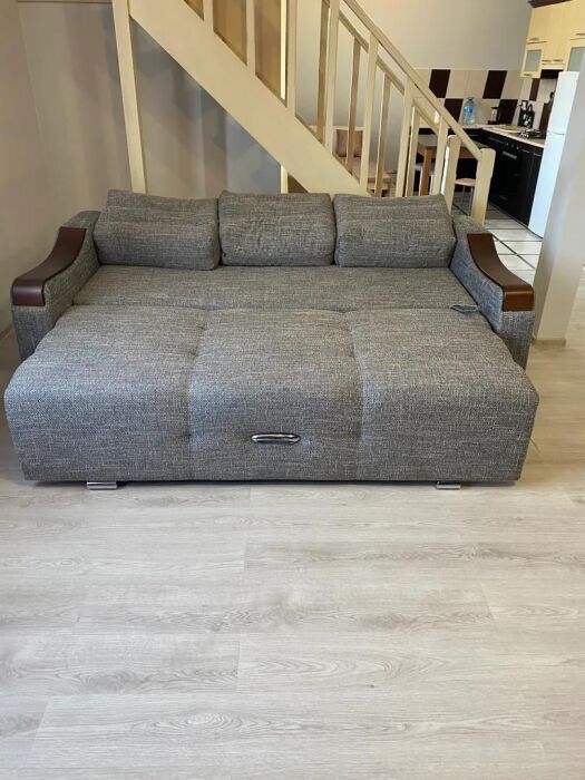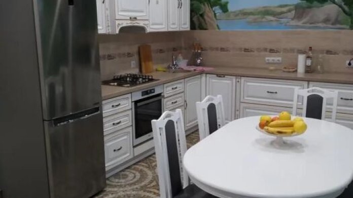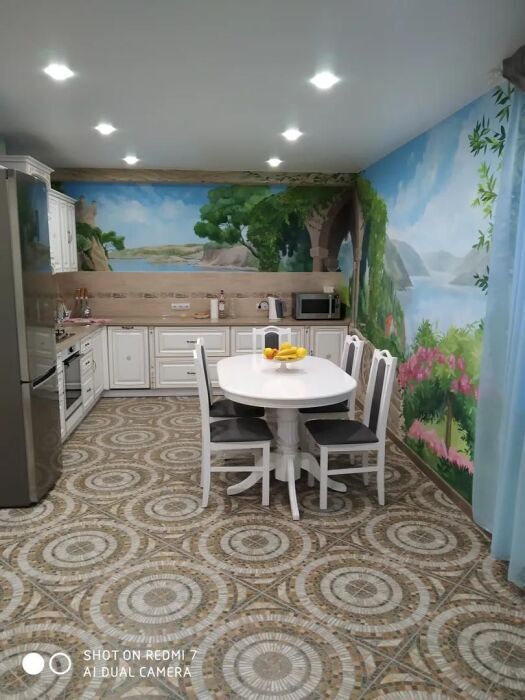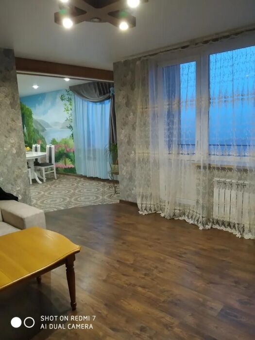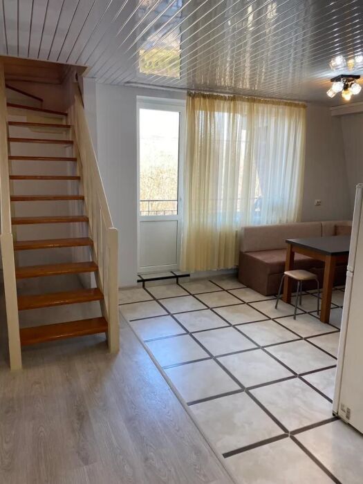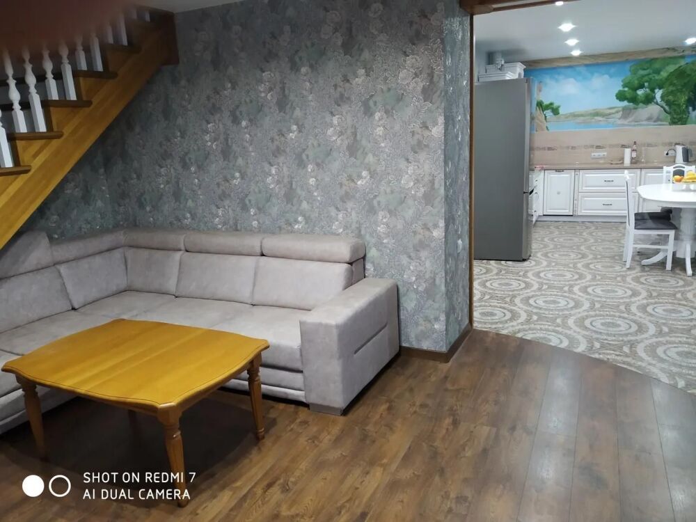 Практически вся мебель из натурального дерева. Двухуровневая квартира с дизайнерским ремонтом на 4 этаже возле моря. Из окна (с балкона) вид на город и частично залив.