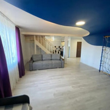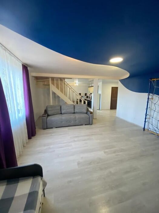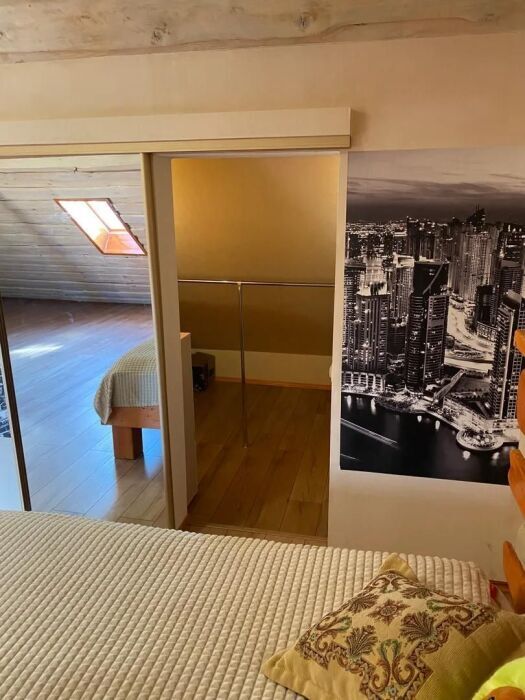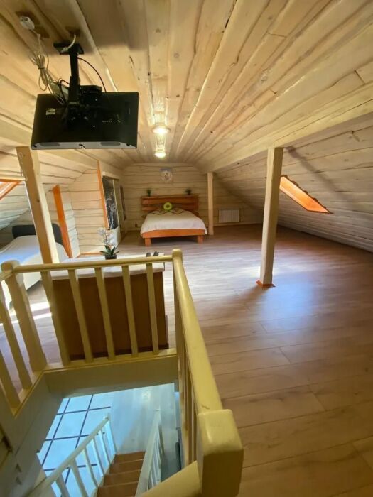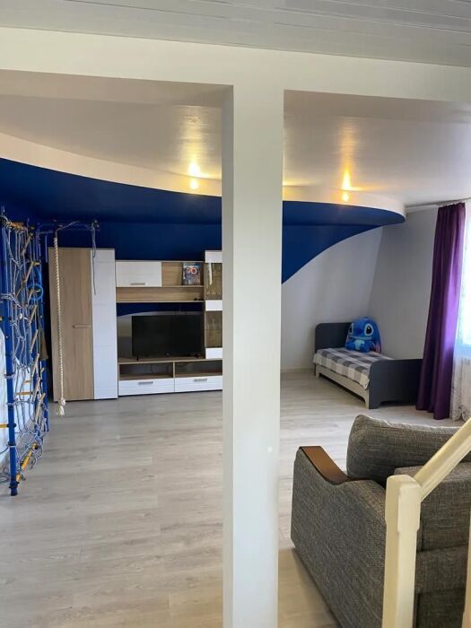 Большой двухуровневый номер с балконом. На первом уровне: полностью оборудованная кухня с раскладным угловым диваном(спальное место 1, 2*1, 9) и обеденным столом, зал с диван-кроватью(спальное место 2, 0*2, 2), детской кроваткой(0, 7*1, 7), телевизором и шкаф-стенка. Также на первом уровне прихожая и санузел. На втором уровне есть гардеробная, большая двуспальная кровать(1, 6*2) и детская кровать(0, 7*1, 7). Второй уровень также имеет гардеробную тумбу и телевизор.