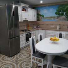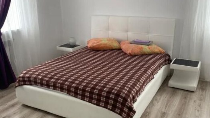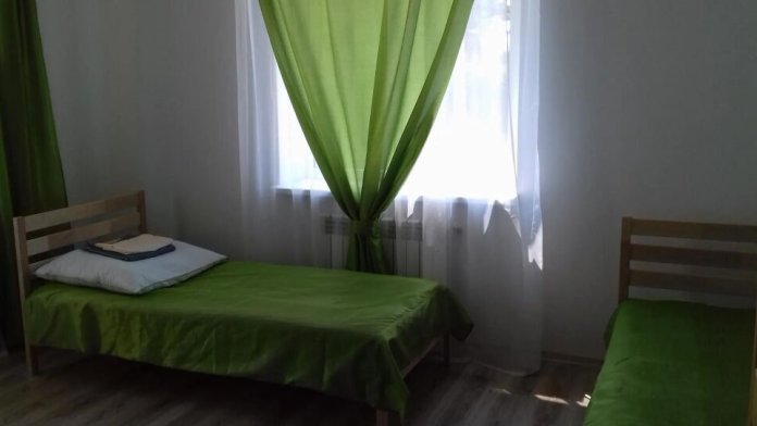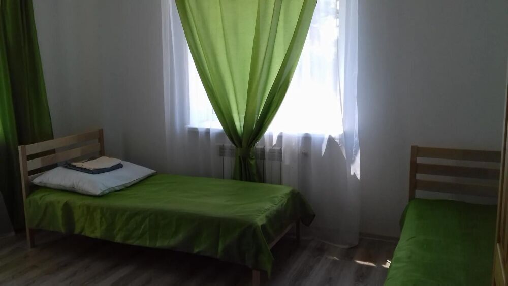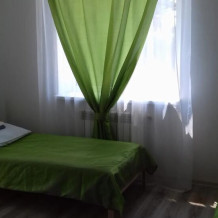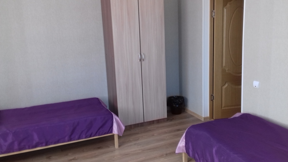 Семейный номер для 4 человек. Размещение на одной большой кровати(2чел)+раскладывающийся диван-кровать(2чел). В номере есть холодильник, телевизор, шкаф, тумбы, столик с двумя стульями. Кухня (на три номера) и два санузла (на три номера) общие.