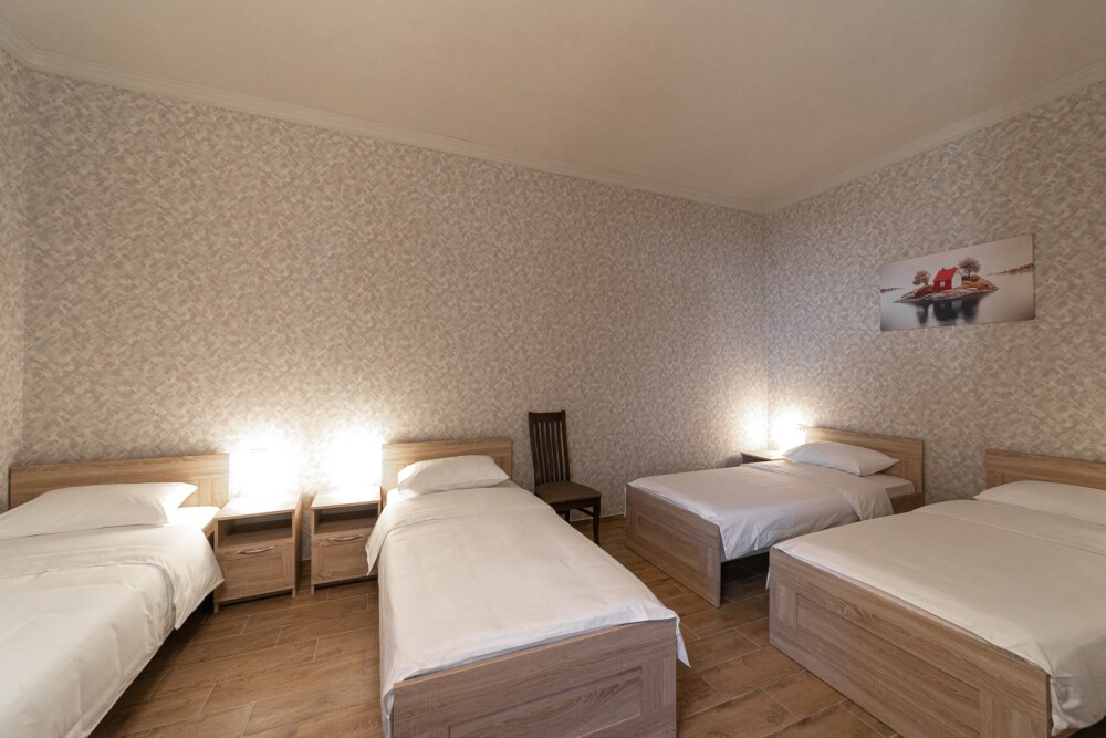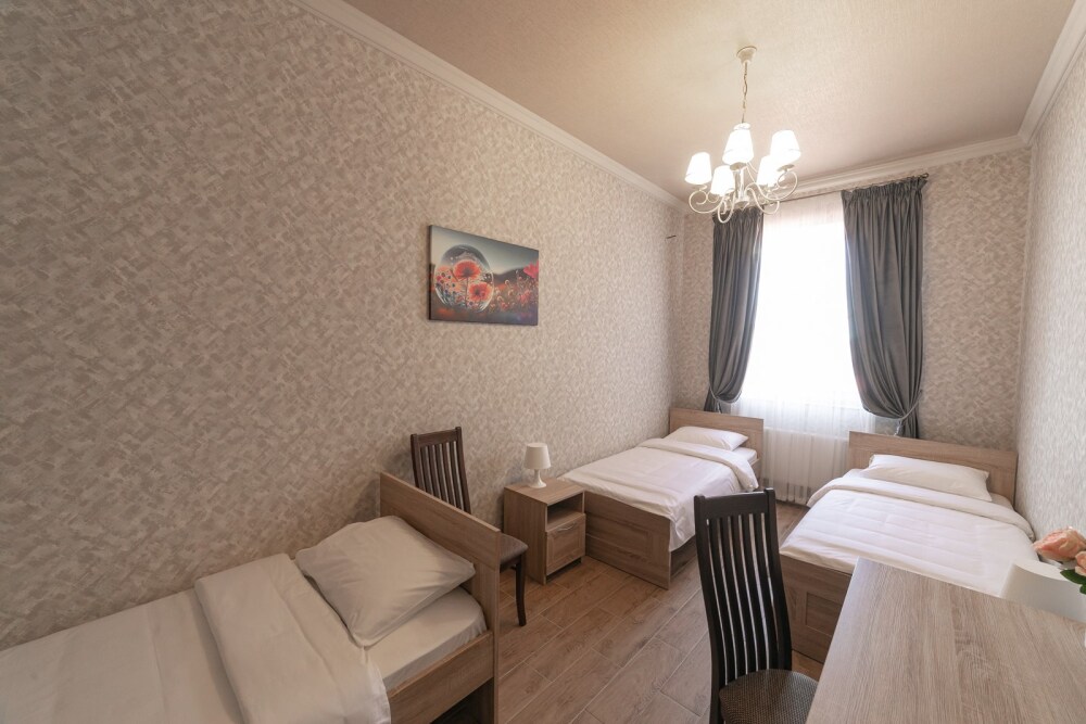 Уютный однокомнатный номер с тремя односпальными кроватями.