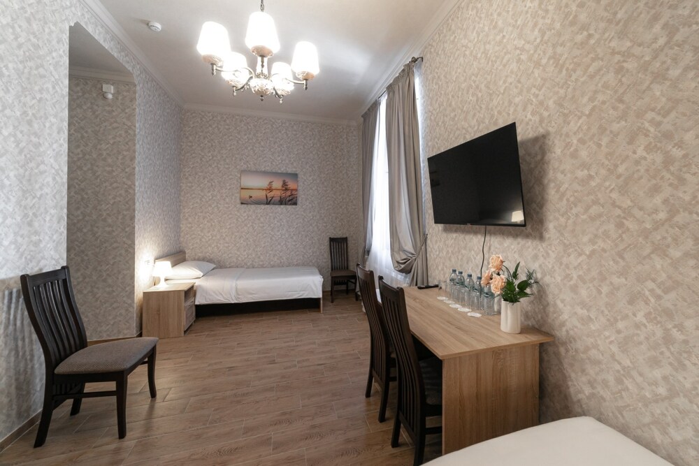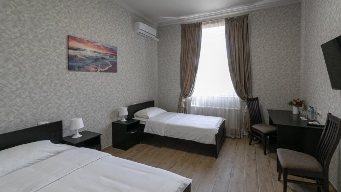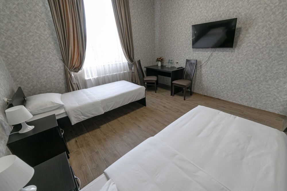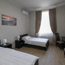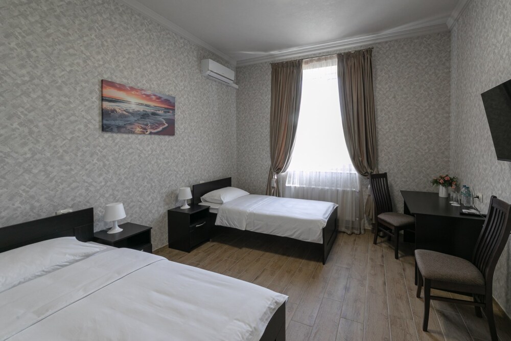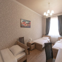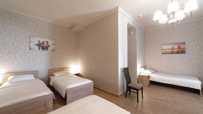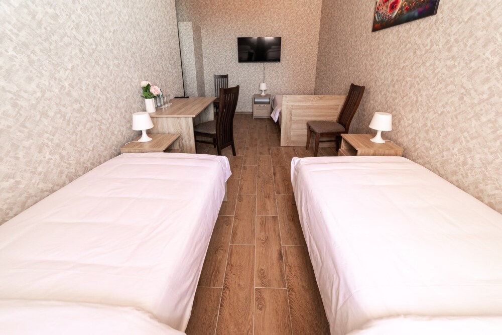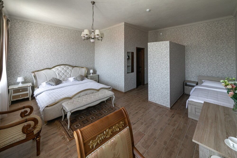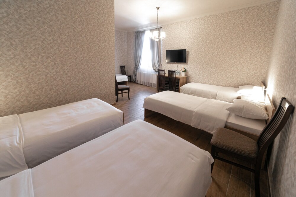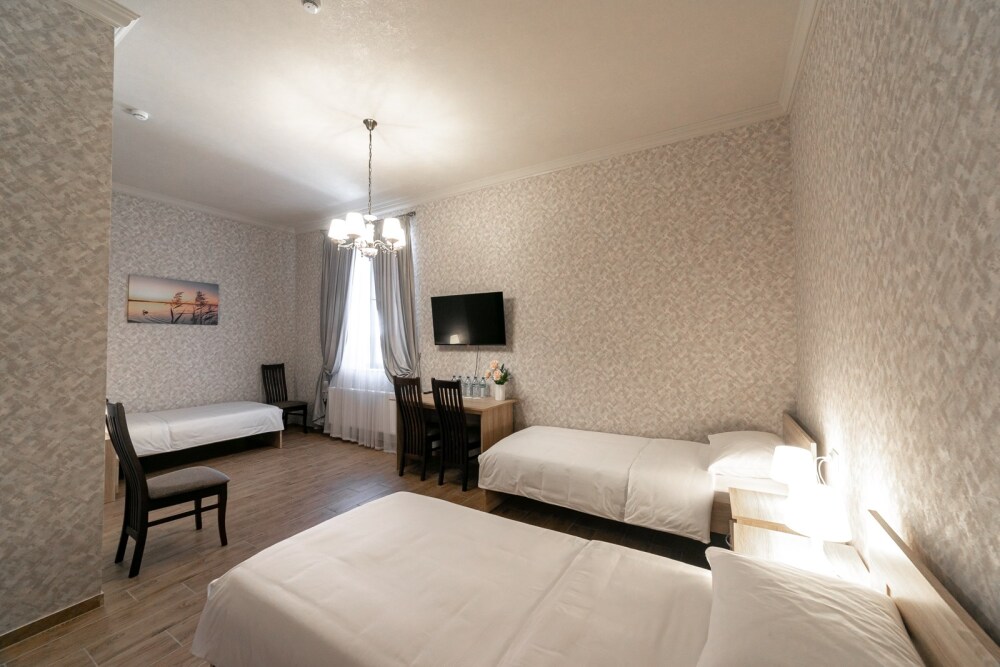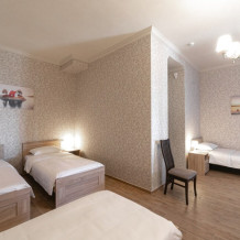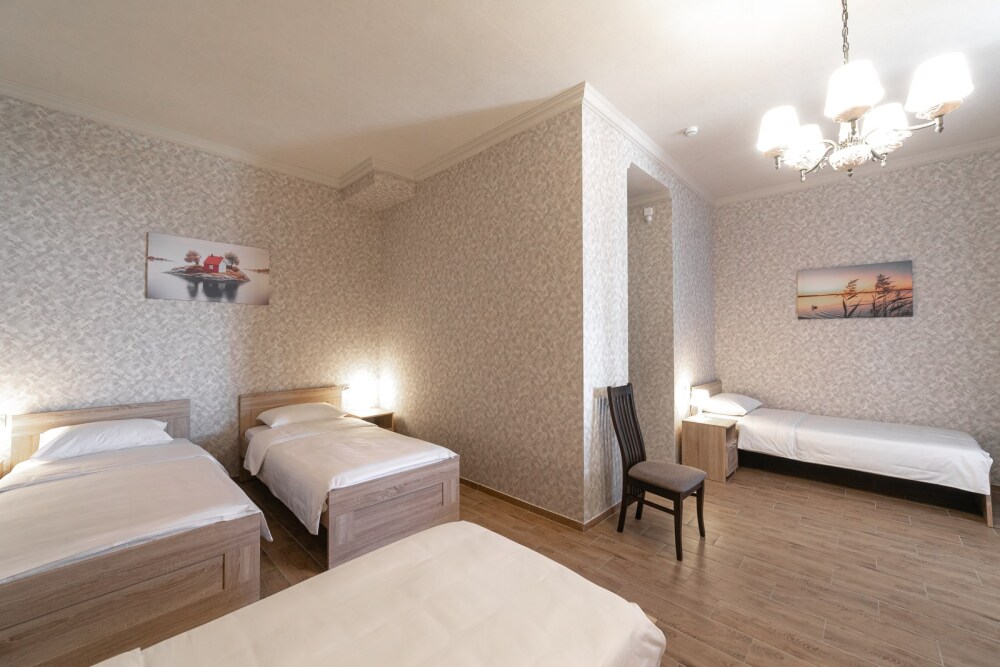 Просторный однокомнатный номер с двуспальной и односпальной кроватями.