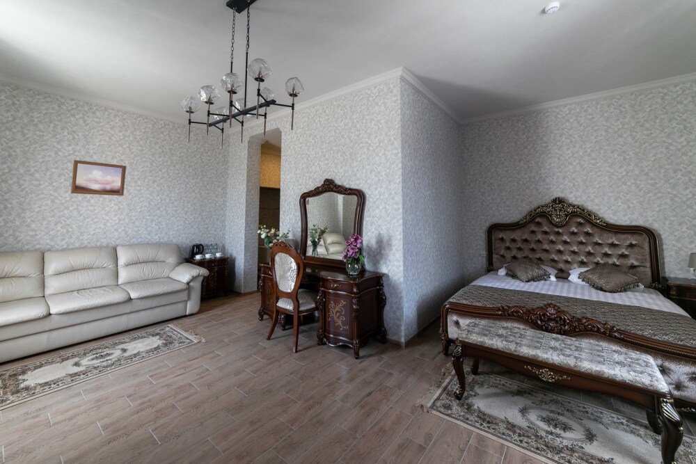 Просторный однокомнатный номер с двуспальной кроватью и диваном.