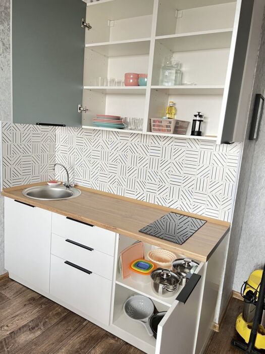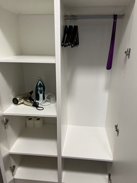 - Бытовая техника: телевизор со Смарт ТV, холодильник, микроволновая печь, электрочайник, утюг, фен, стиральная машина, водонагреватель.