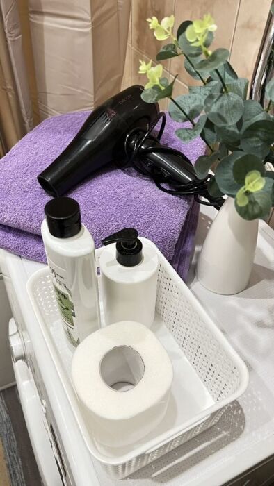 - Бытовая техника: телевизор, холодильник, микроволновая печь, электрочайник, утюг, фен, стиральная машина.