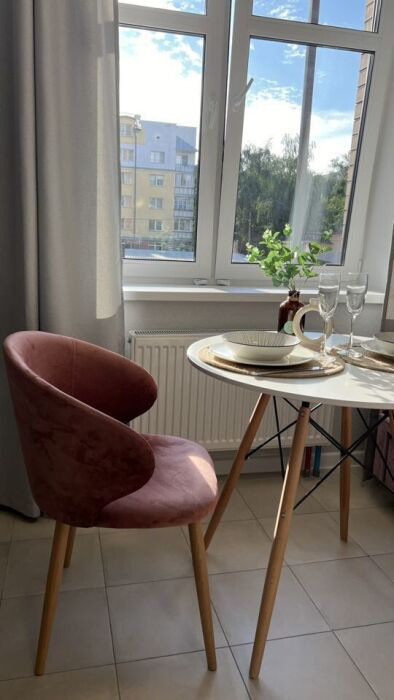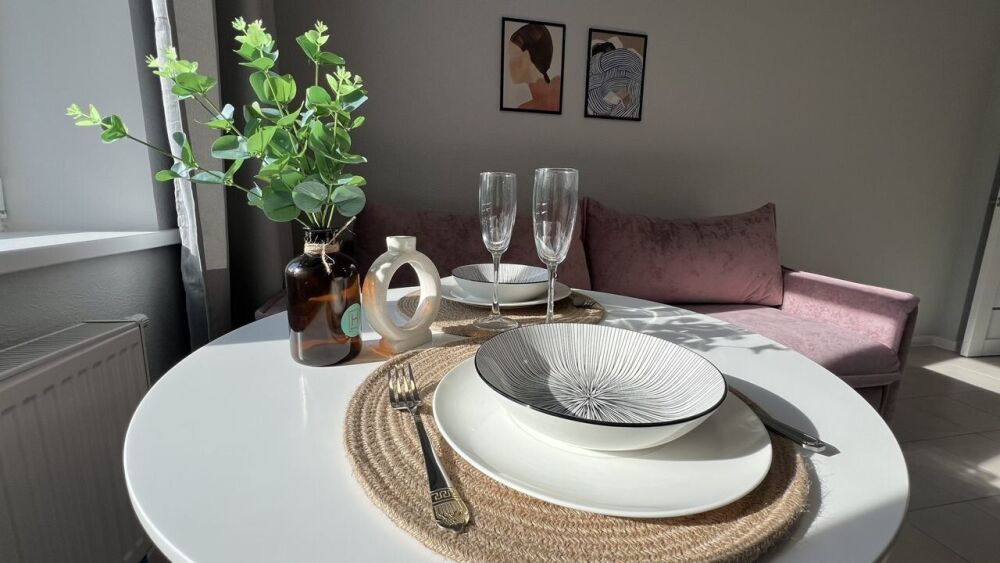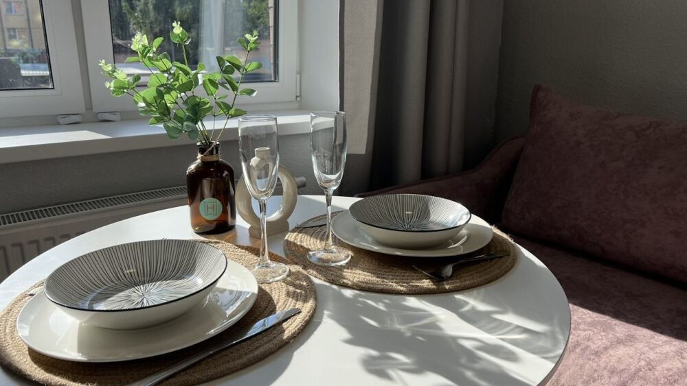 - кухня (обеденный стол и стулья, плита, СВЧ, холодильник, чайник, посуда, столовые приборы).