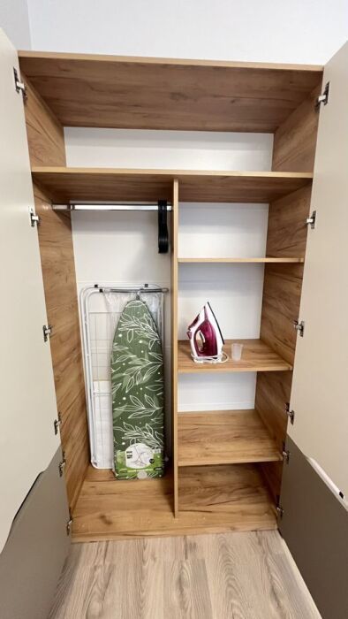 - гардеробный шкаф с утюгом и гладильной доской, фен.
