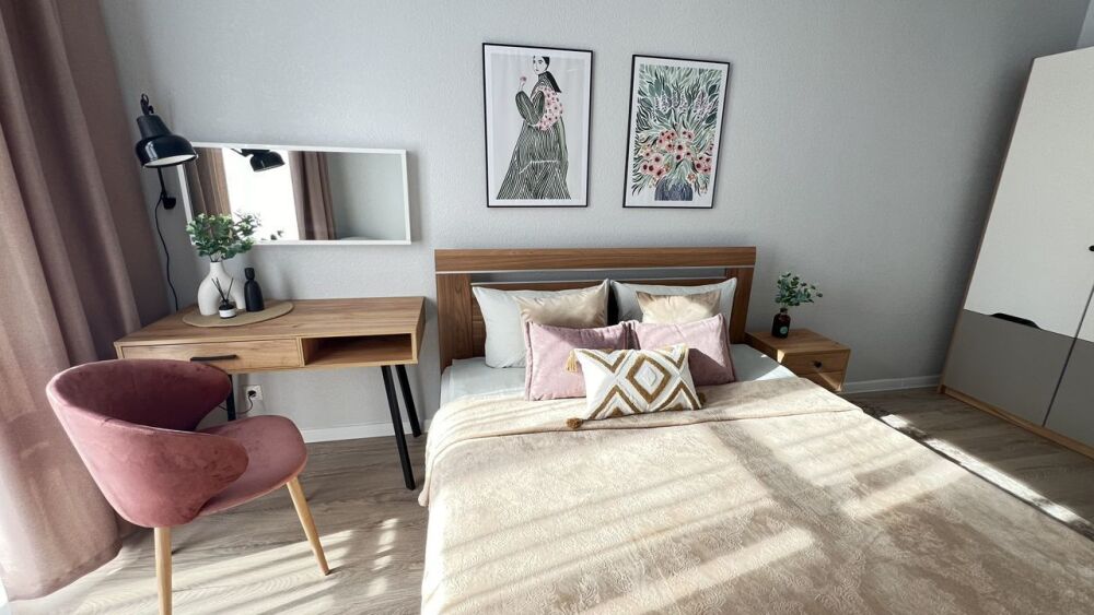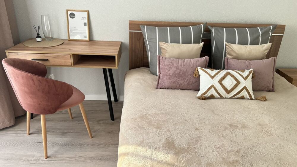 - кpовать для двоих (160 х 200см) с шикарными подушками.