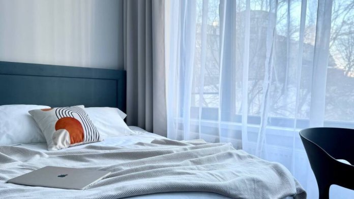 - Двуспальная кровать застелена постельным бельем и диван для 1-2 гостей.