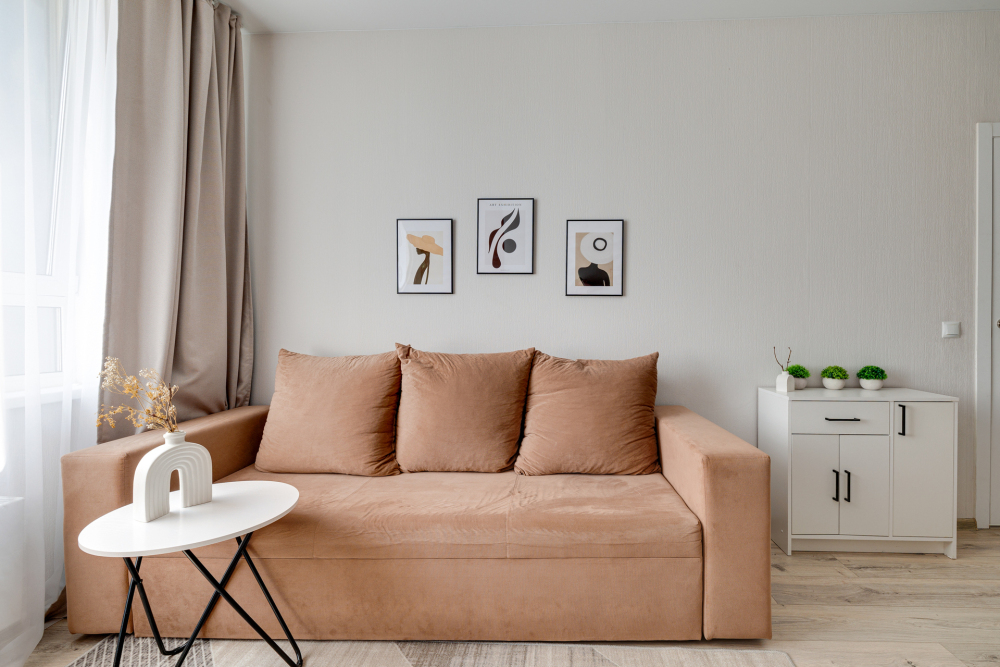 - Двуспальная кровать с матрасом застелена постельным бельём и диван для 1-2 гостей.