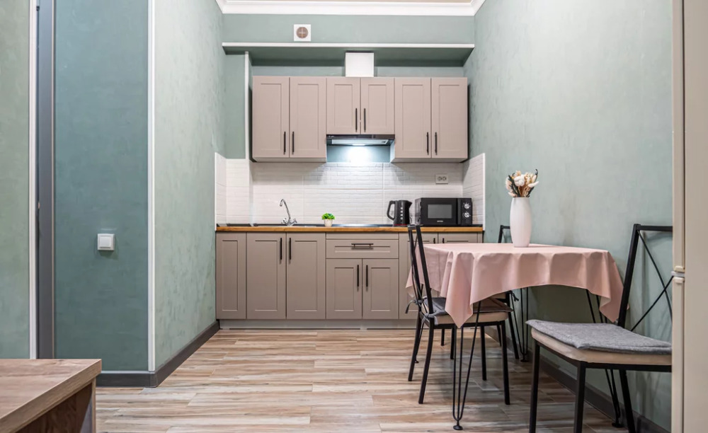 Оборудованная кухня: посуда, холодильник, микроволновка, кастрюли, сковорода, электрический чайник, чай, кофе, сахар.