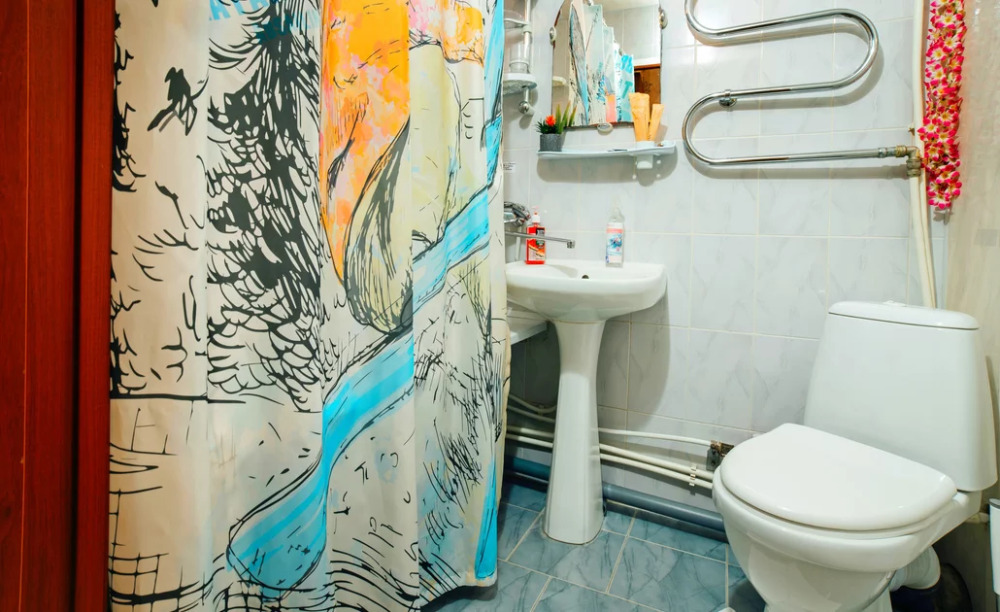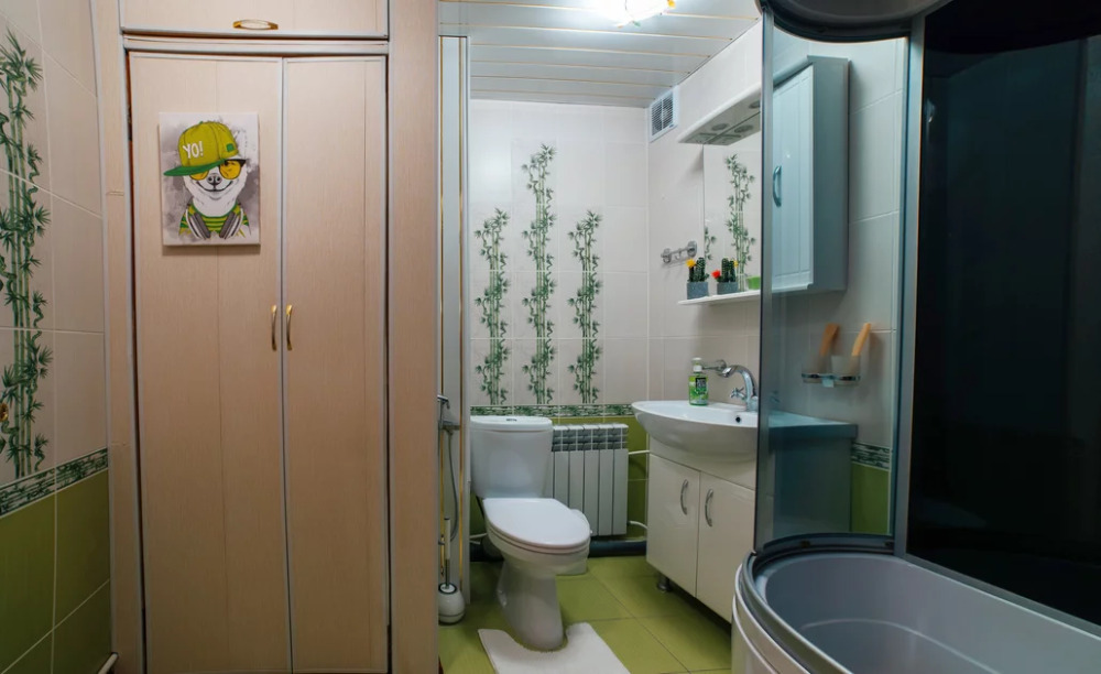 Ванна, душевая кабина, стиральная машина, фен, утюг, гладильная доска, тапочки, сушилка, шампунь, мыло.