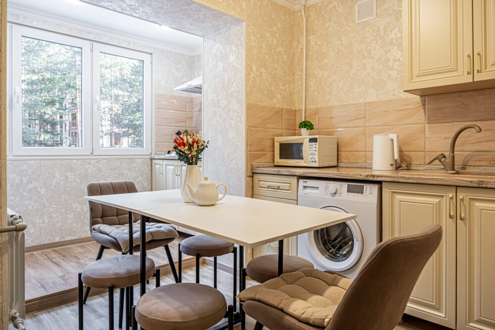 - Оборудованная кухня: посуда, холодильник, микроволновка, кастрюли, сковорода, электрический чайник, чай, кофе, сахар.