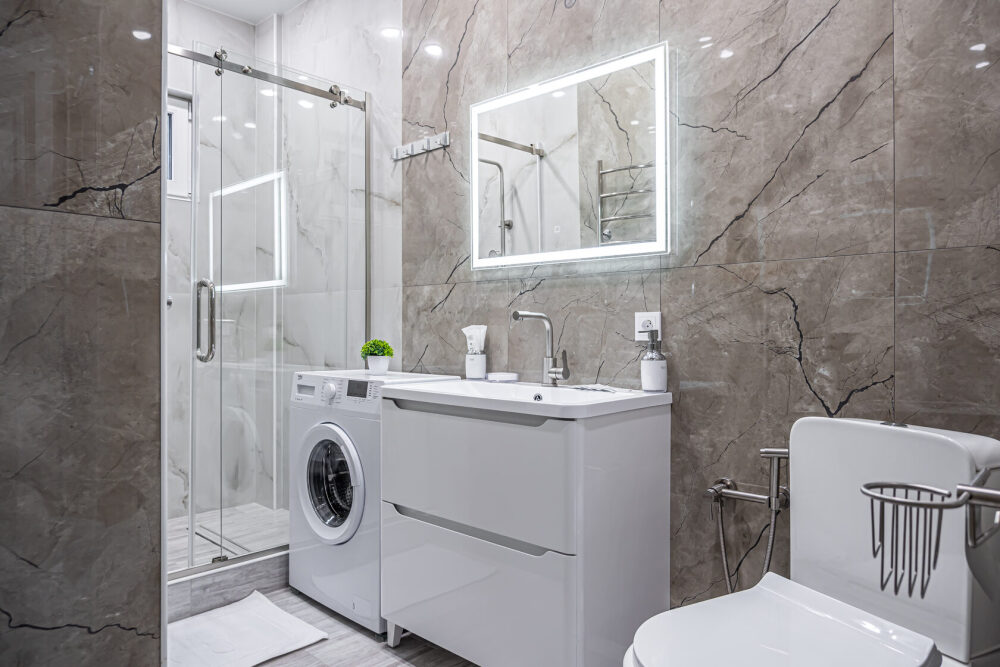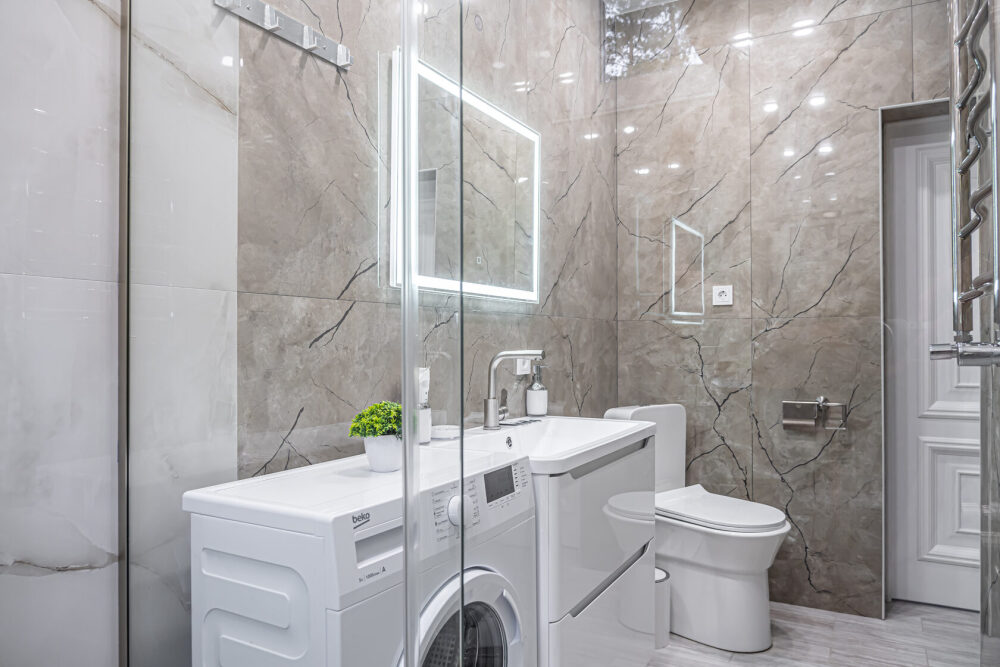 - душ, стиральная машина, фен, утюг, гладильная доска, тапочки, сушилка, шампунь, мыло.