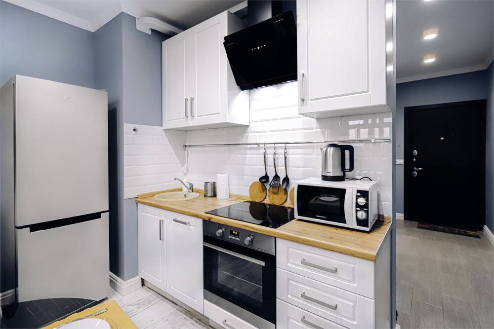 - Современная кухня в полной комплектации, будто приглашает приготовить что-то вкусное и провести время за уютным ужином. Мини-бар позволит вкусно перекусить в перерыве между делами.