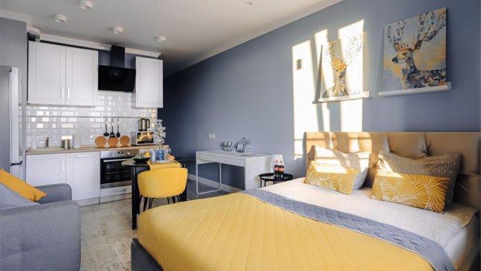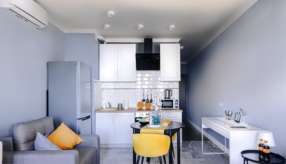 - Большая кровать с удобным матрасом, постельным бельем из страйп-сатина. Яркие акценты, такие как желтые подушки и плед, создают атмосферу солнечного настроения даже в пасмурные дни. Скоростной Wi-Fi и современное SMART TV.