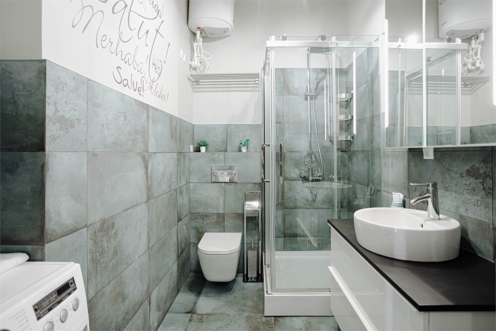 - Опрятная ванная комната с блестящими кранами и мягкими полотенцами, гигиеническими и косметическими наборами. Дополнительно присутствуют фен, утюг, сушилка.