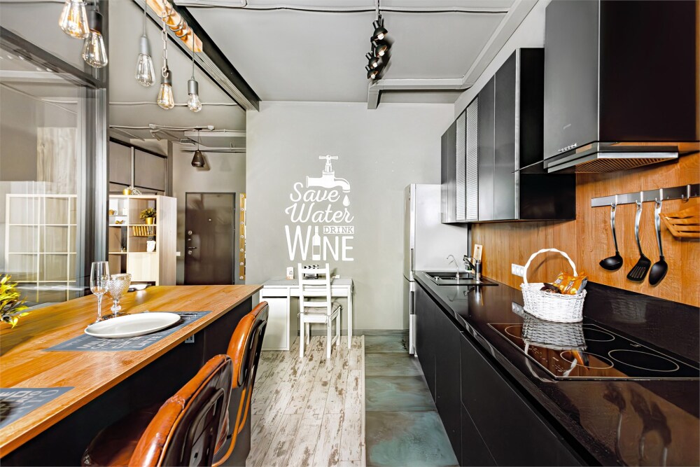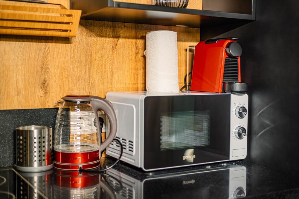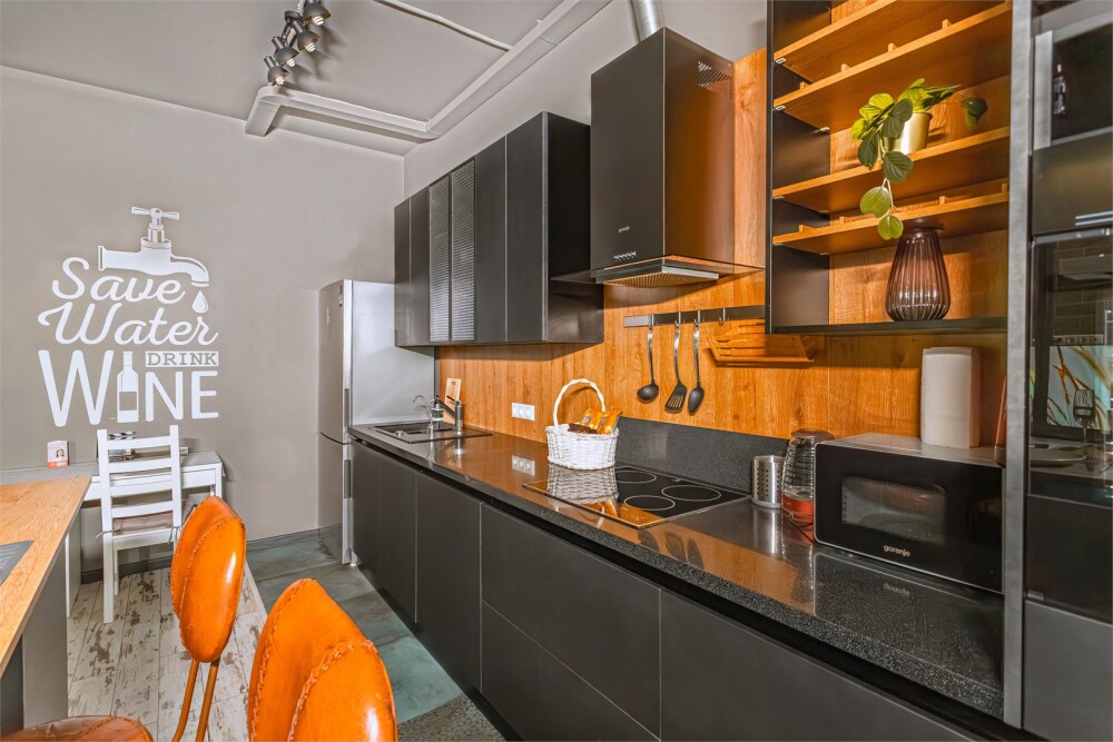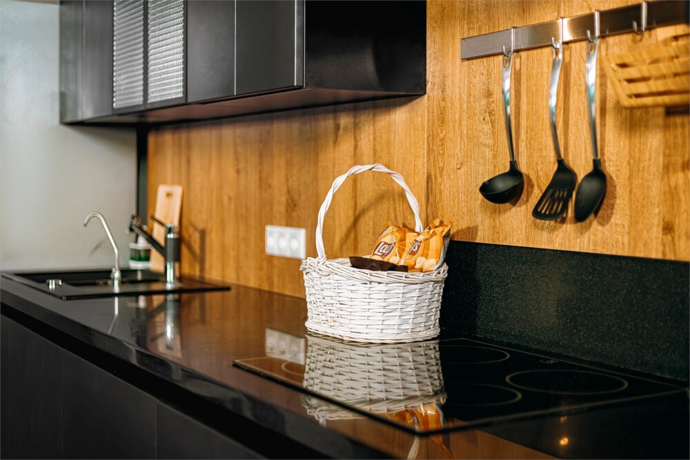 - Большая кухня в полной комплектации становится сердцем квартиры: здесь можно с комфортом собрать компанию друзей, устроить романтический вечер или сосредоточиться на работе за чашечкой ароматного кофе. Минибар позволит вкусно перекусить в перерыве между делами.
