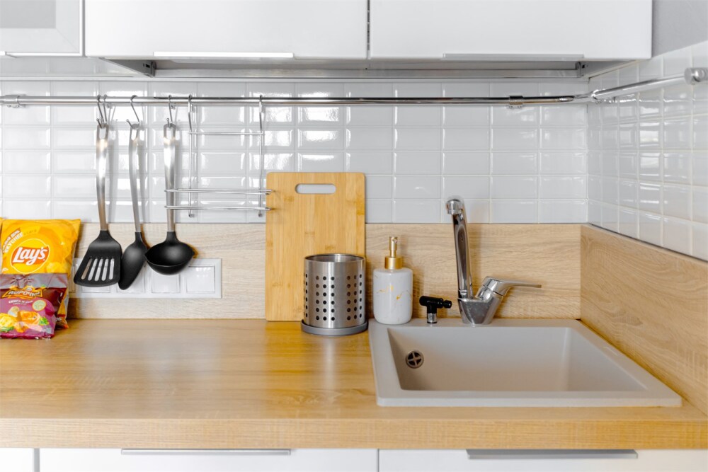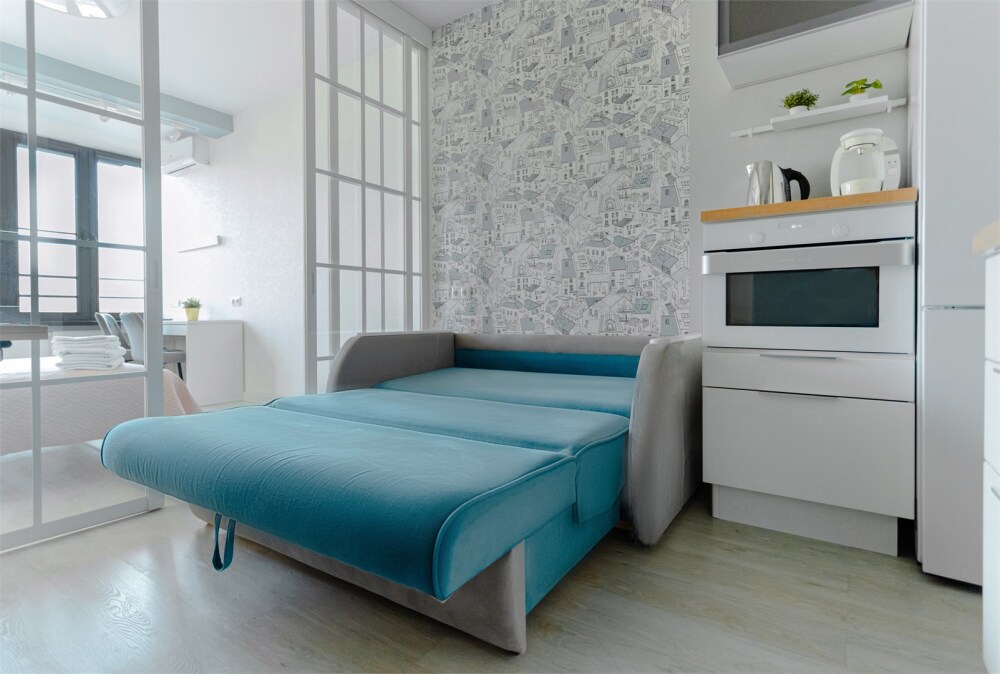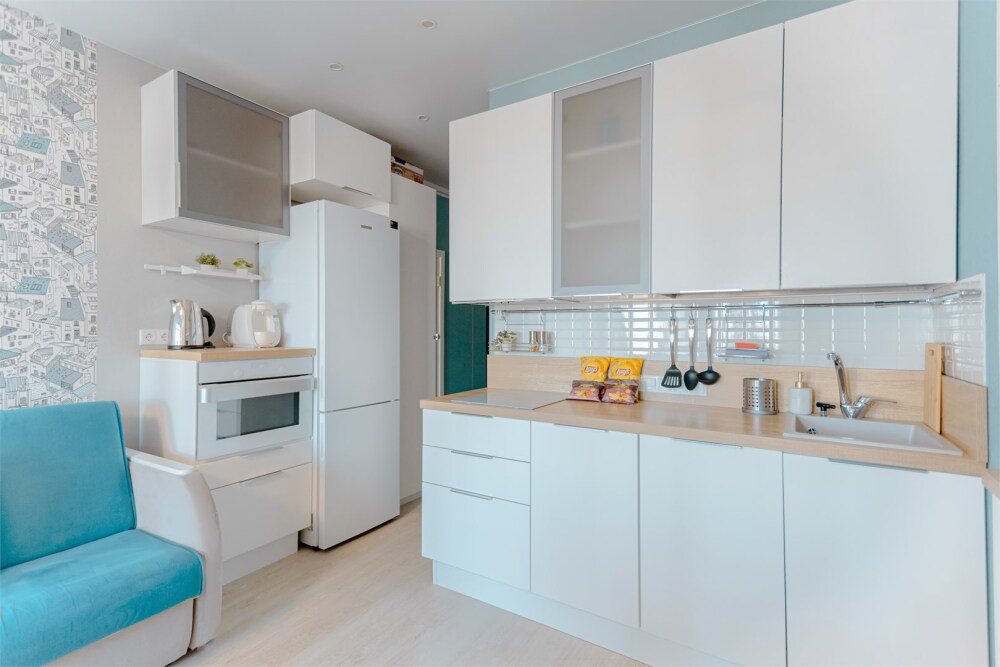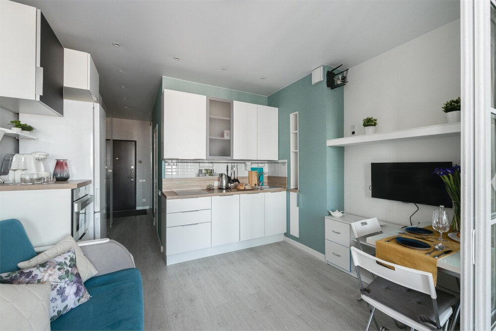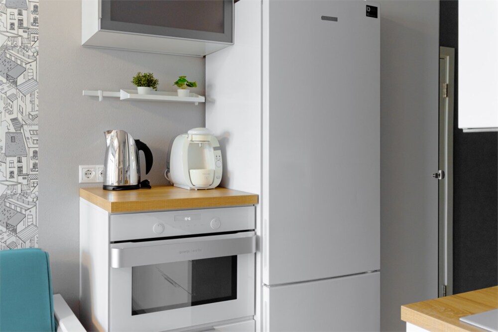 - Современная кухня в полной комплектации. Мини-бар позволит вкусно перекусить в перерыве между делами.