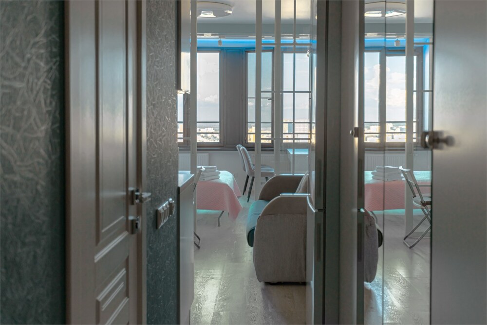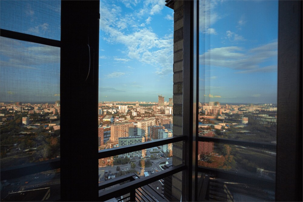 - Высокие окна заливают пространство естественным светом, открывая захватывающий панорамный вид на город.