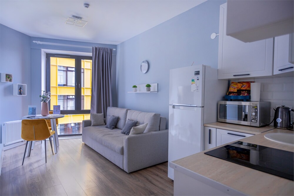 - Современная кухня в полной комплектации, радует минимализмом и эстетикой, а раскладной диван в гостиной делает квартиру универсальной. Минибар позволит вкусно перекусить в перерыве между делами.