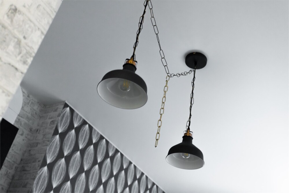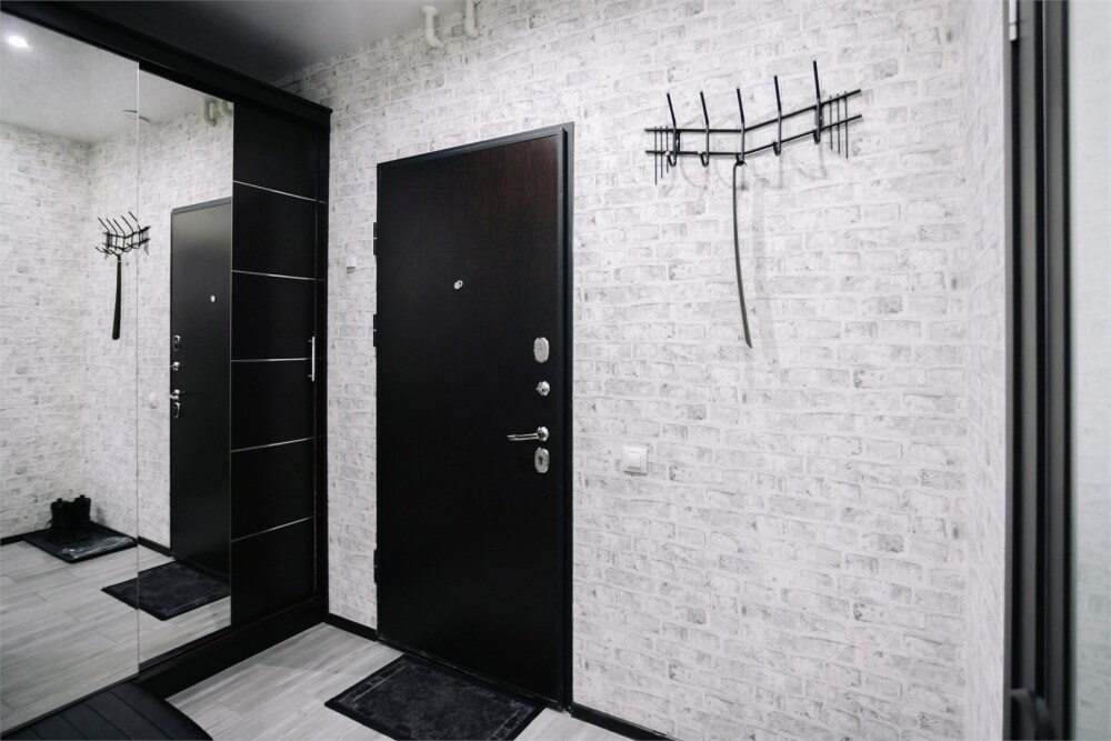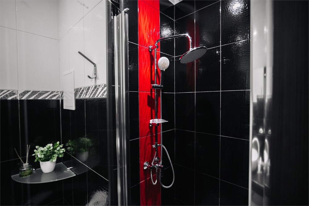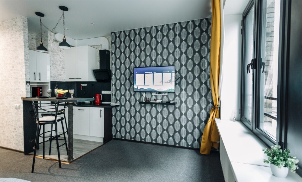 Стильное пространство выполнено в контрастных чёрно-белых тонах, которые подчеркивают её современность и лаконичность. Яркие красно-жёлтые элементы добавляют динамики и создают