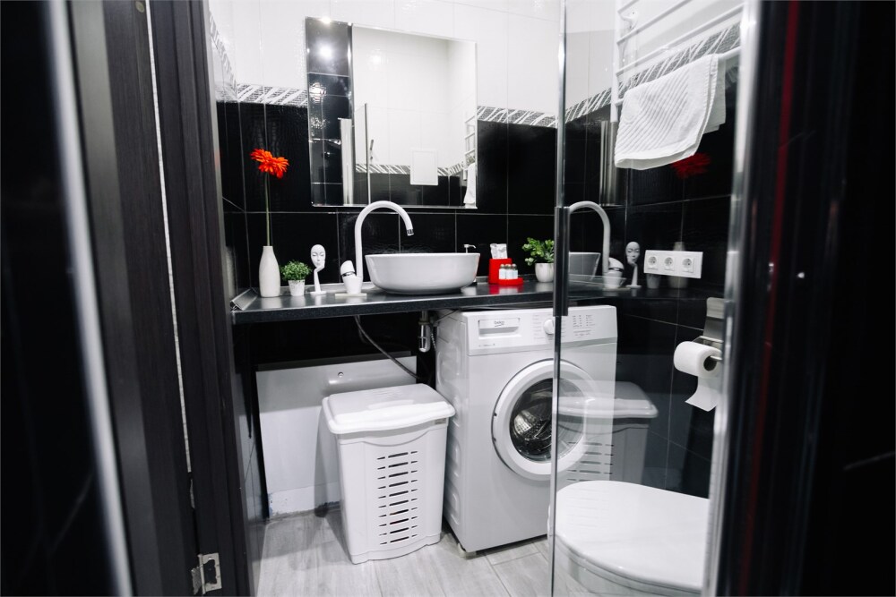 - Опрятная ванная комната с блестящими кранами и мягкими полотенцами, гигиеническими и косметическими наборами. Дополнительно присутствуют фен, утюг, сушилка.