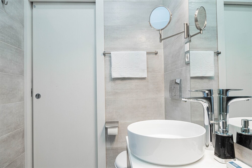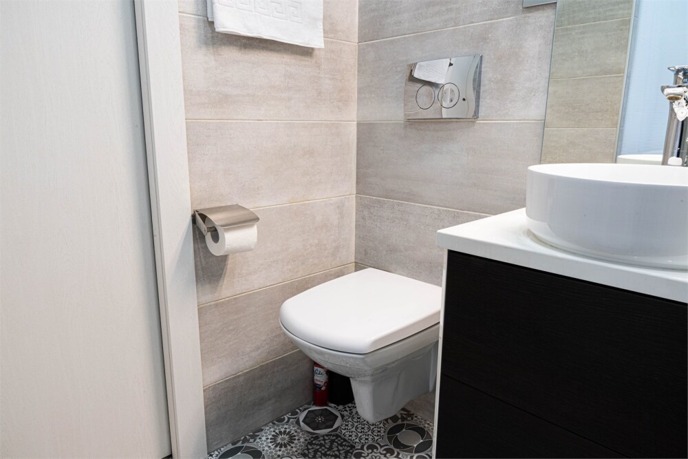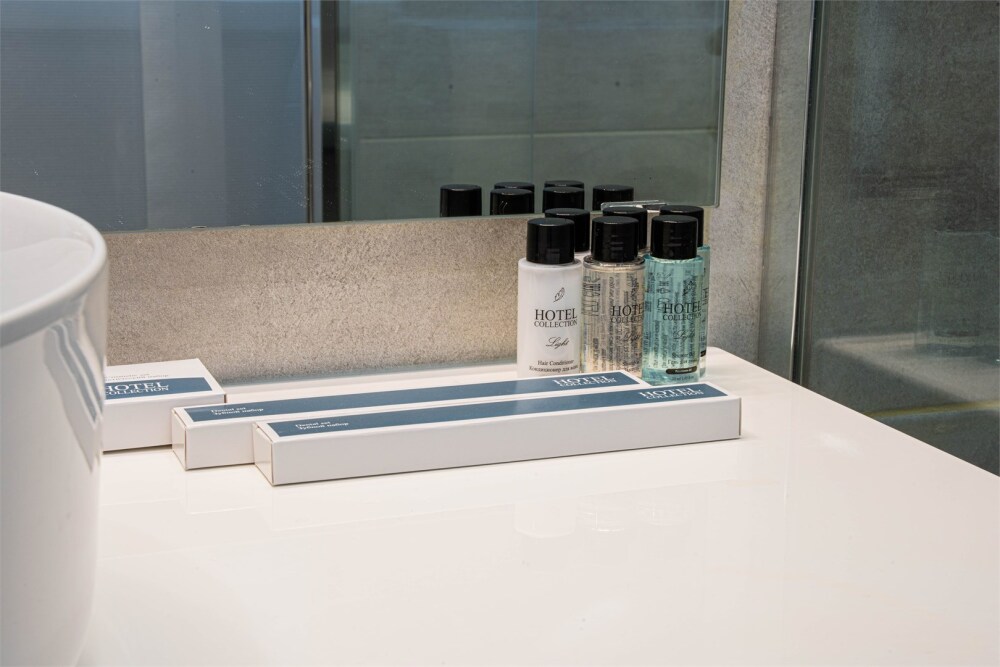 - Опрятная ванная комната с блестящими кранами и мягкими полотенцами, гигиеническими и косметическими наборами. Дополнительно присутствуют фен, утюг, сушилка.