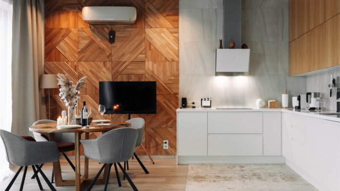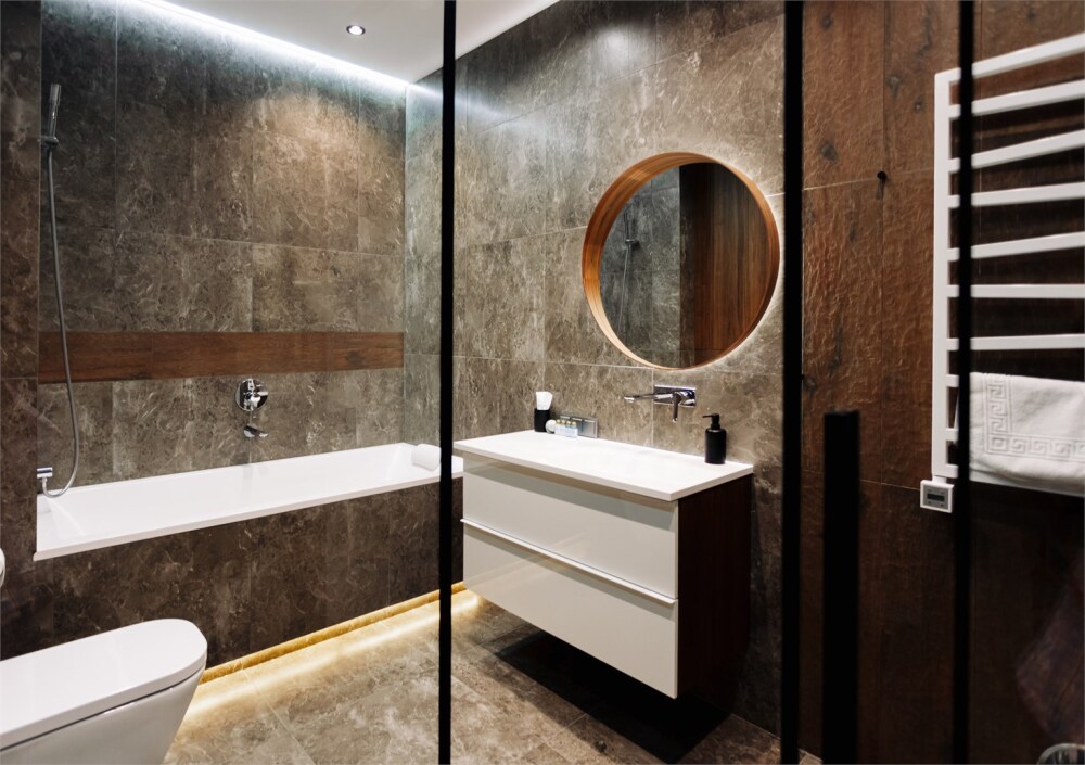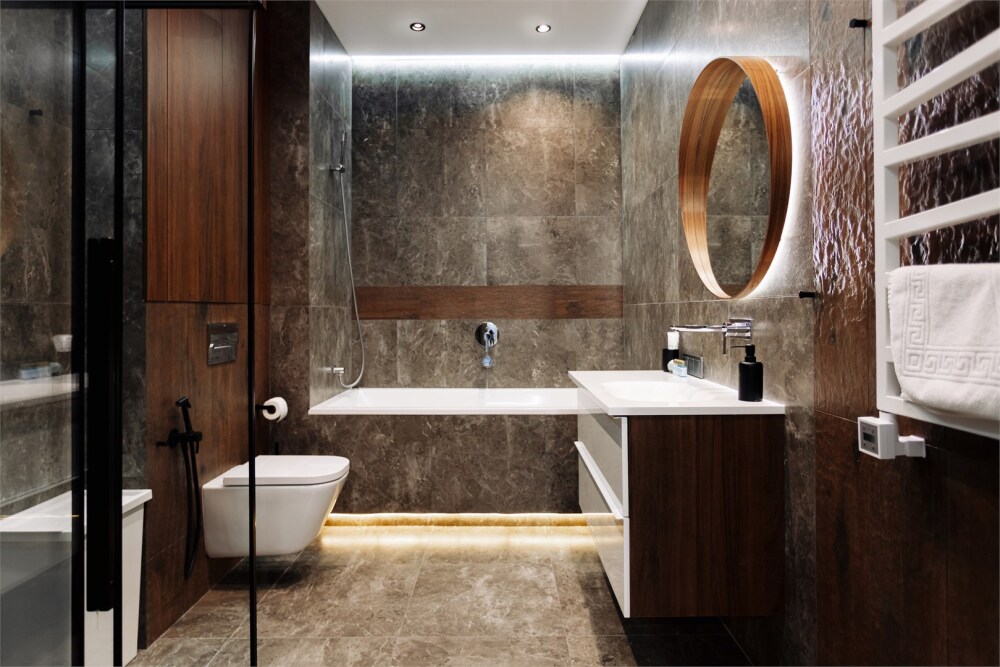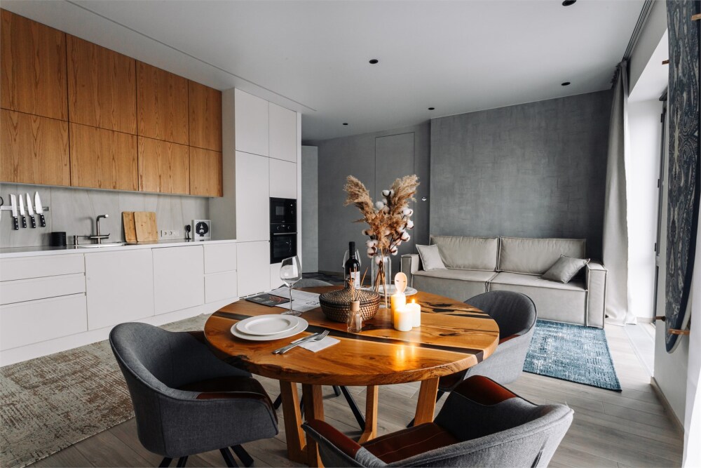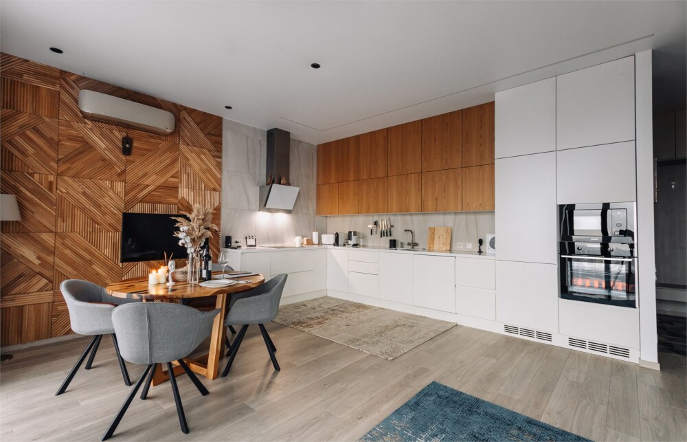- Стильная кухня в полной комплектации, будто приглашает приготовить что-то вкусное и провести время за уютным ужином. Мини-бар позволит вкусно перекусить в перерыве между делами.