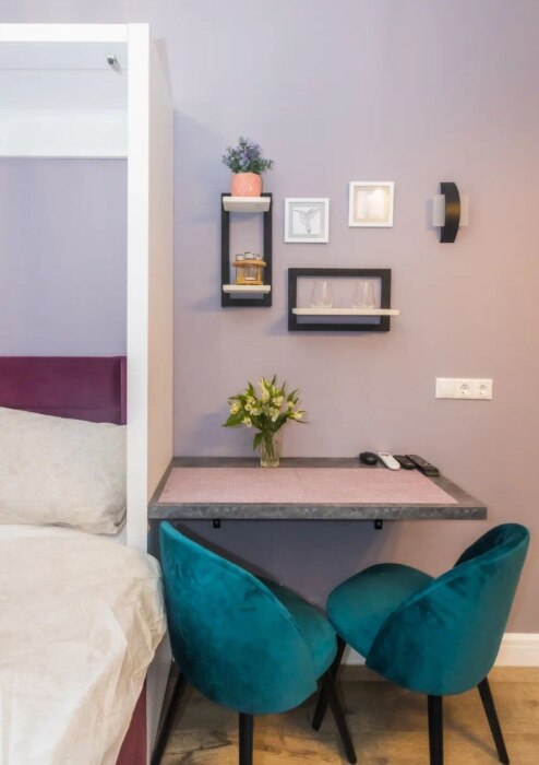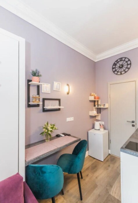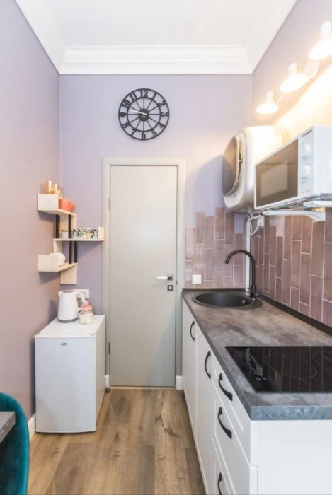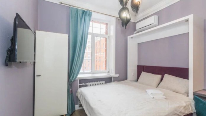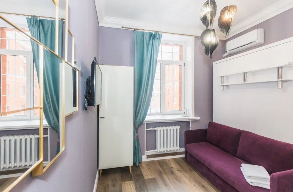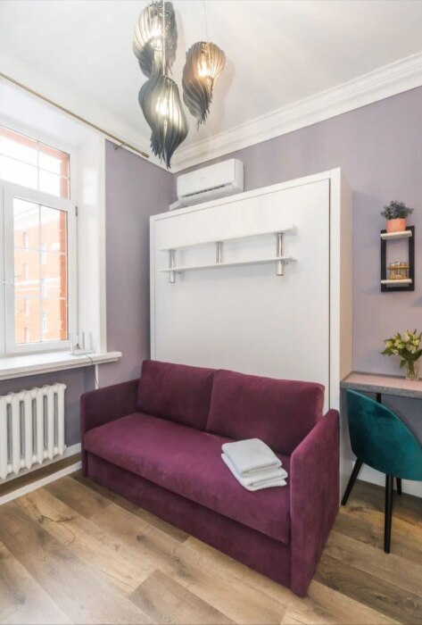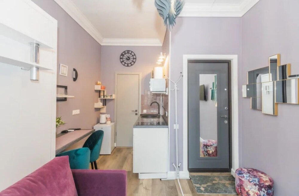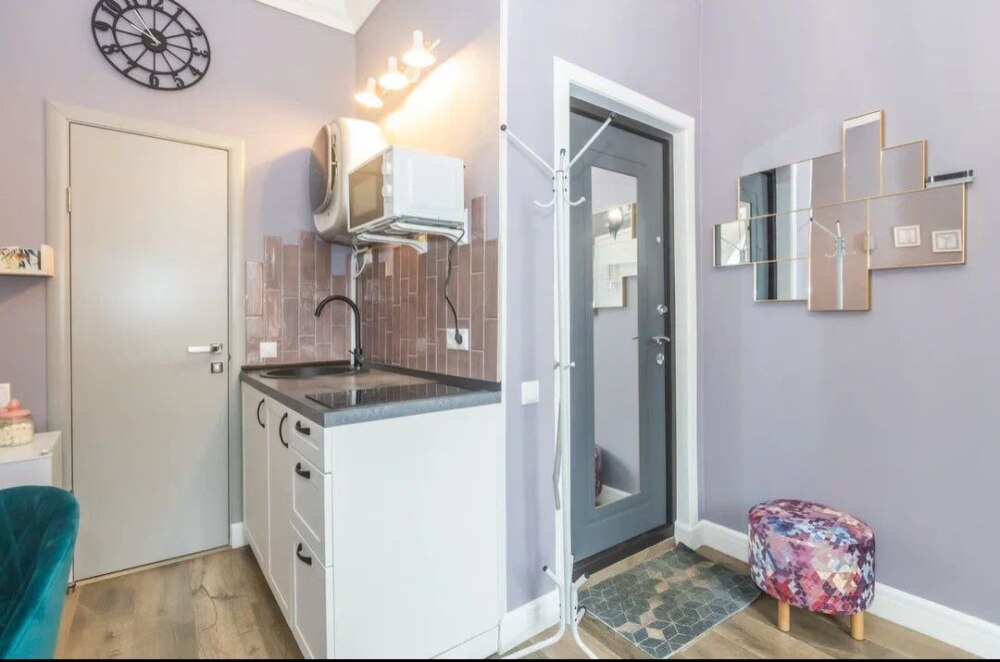 Мы оборудовали студию всем необходимым. Вы заселяетесь в студию после профессионального клининга. В комнате находится двуспальная кровать с качественным постельным бельем. Вы можете отдохнуть за просмотром телевизора. Кухонная зона оснащена техникой для приготовления пищи: микроволновая печь, холодильник, плита, чайник, столовые приборы, кастрюля, обеденный стол. В ванной комнате Вас ждёт полный комплект средств гигиены (шампунь, гель, мыло, бумага). Для Вашего комфорта мы подготовили фен. Также есть стиральная машина.