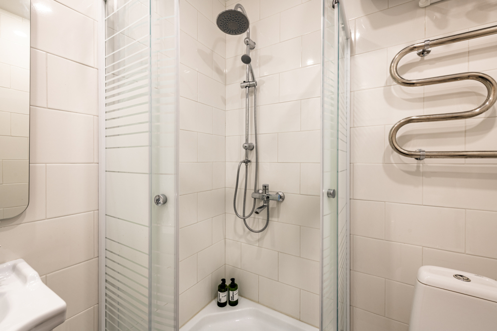 Совмещенный санузел и душевая кабина Махровые полотенца, свежее постельное белье и средства личной гигиены.
