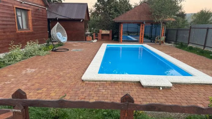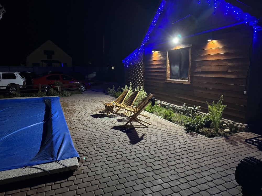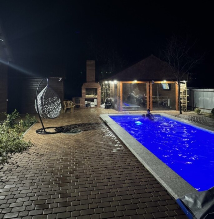 На территории имеется: детская площадка, баня, большая беседка с дубовой мебелью и камином, летний бассейн.