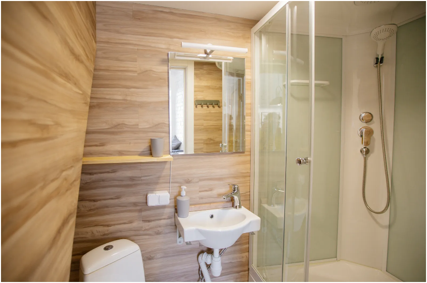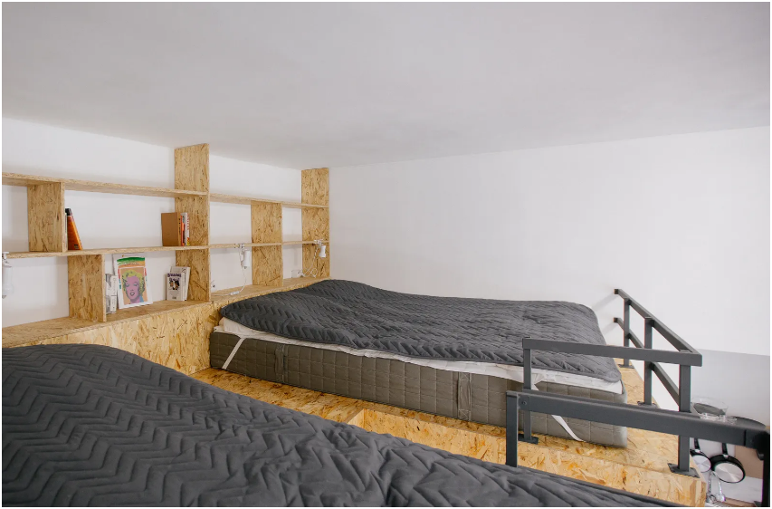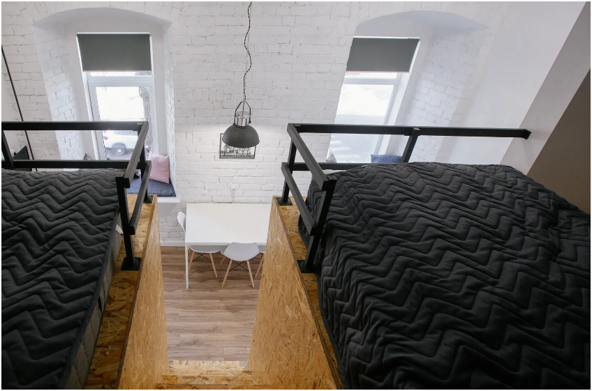 В квартире сделана двухуровневая планировка со всеми удобствами, апартаменты рассчитаны на 5 человек (максимум). На втором уровне расположены мягкие кровати на троих человек, на первом уровне - удобный раскладывающийся диван для двоих гостей. Имеется кухонная зона для готовки пищи, душевая кабина в квартире.