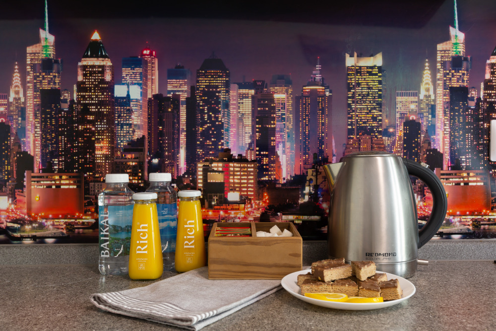 - плита, микроволновка, духовка, чайник, холодильник, мини-бар.