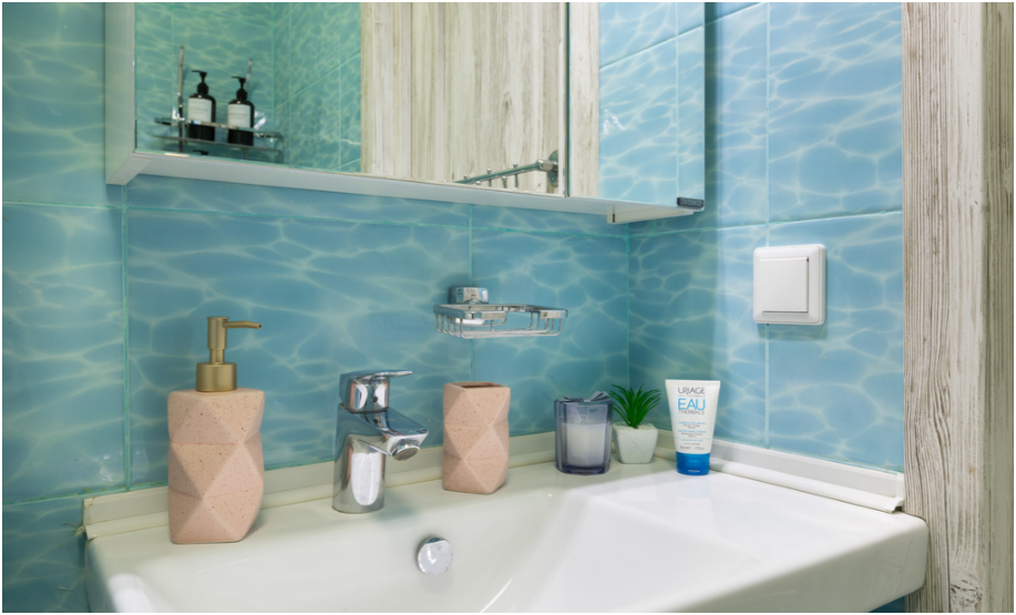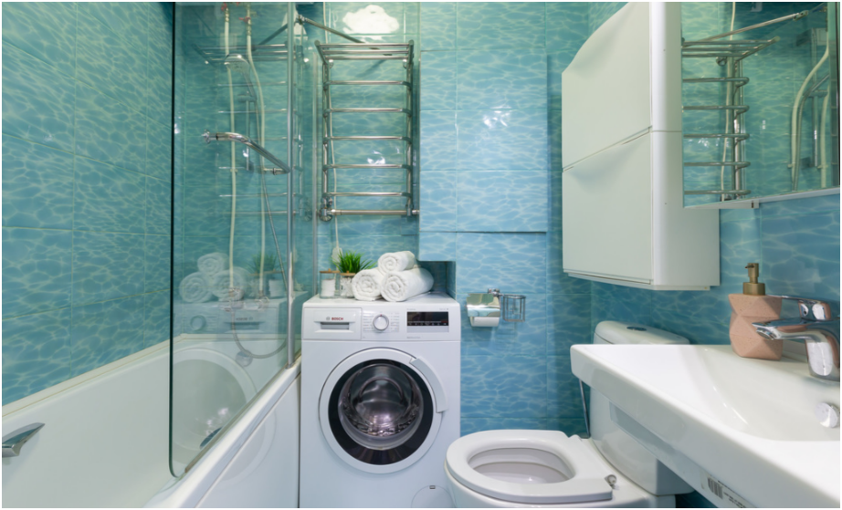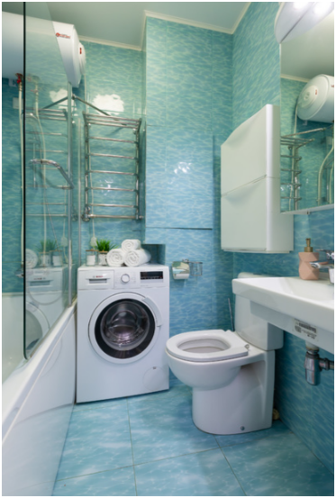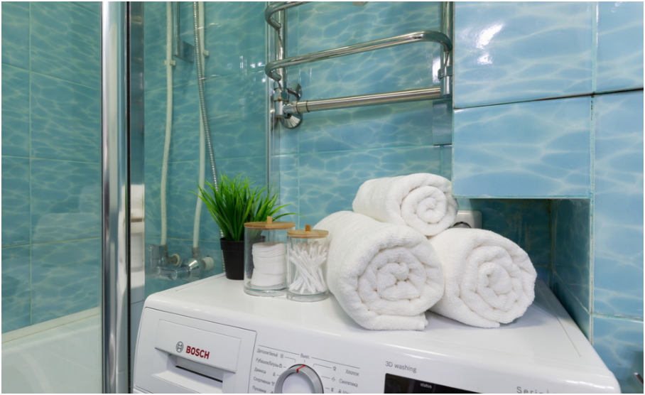 Ванная комната: ванна, стиральная машина, фен, стиральный порошок, средства для мытья посуды, средства гигиены (шампунь, гель для душа, бальзам, жидкое мыло в дозаторах),