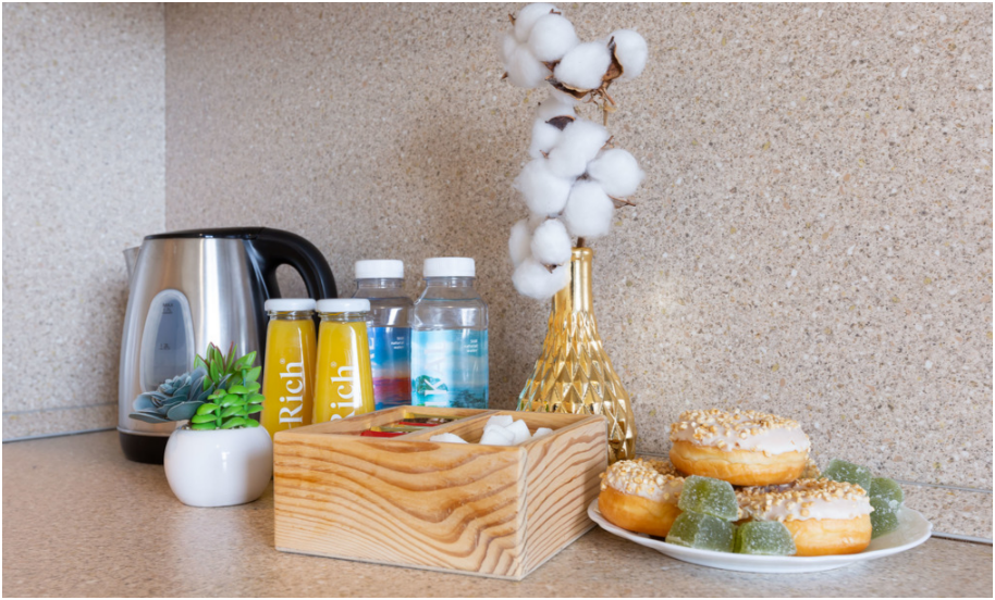 косметический набор, мицеллярная вода, ватные диски, ватные палочки, крем для рук, зубной набор, одноразовые тапочки.