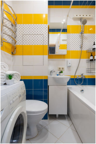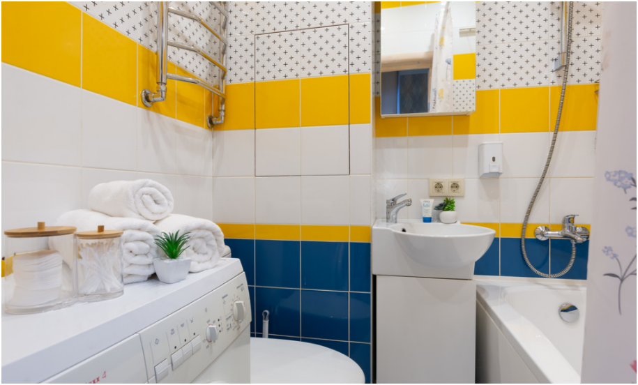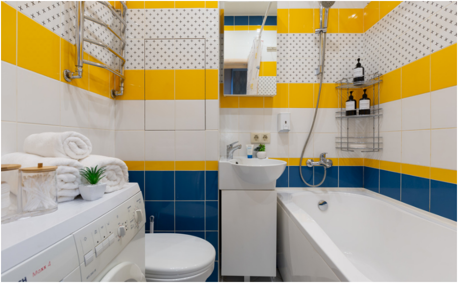 Ванная комната: ванна, стиральная машина, фен, стиральный порошок, средства для мытья посуды, средства гигиены (шампунь, гель для душа, бальзам, жидкое мыло в дозаторах), косметический набор, мицеллярная вода, ватные диски, ватные палочки, крем для рук, зубной набор, одноразовые тапочки.