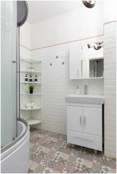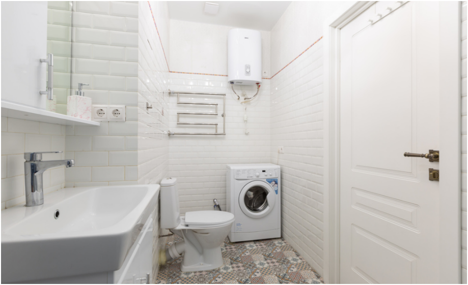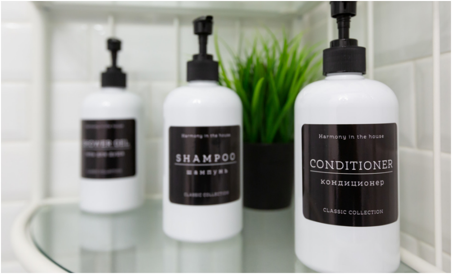 Ванная комната: ванна, стиральная машина, фен, стиральный порошок, средства для мытья посуды, средства гигиены (шампунь, гель для душа, бальзам, жидкое мыло в дозаторах), косметический набор, мицеллярная вода, ватные диски, ватные палочки, крем для рук, зубной набор, одноразовые тапочки.