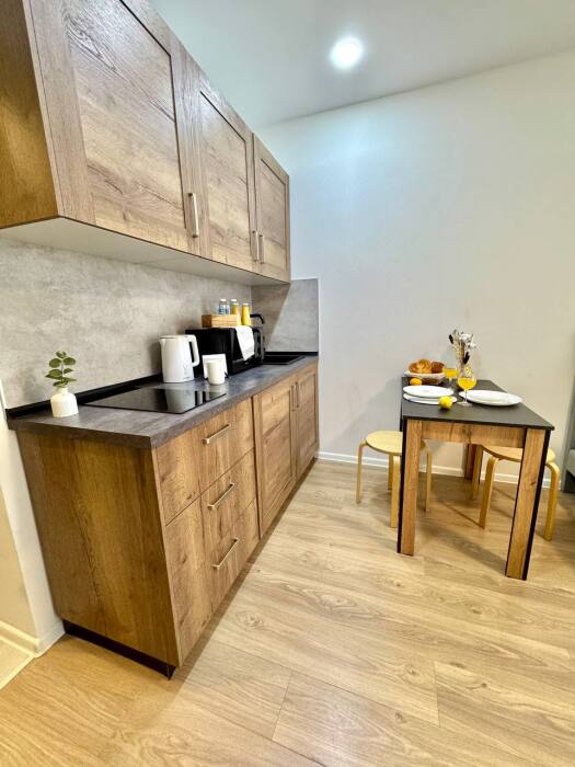 Кухня: плита, микроволновка, чайник, холодильник, набор посуды и все необходимые принадлежности для приготовления пищи, чай/кофе, соль, сахар, растительное масло, специи, минеральная вода.