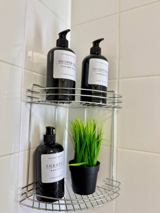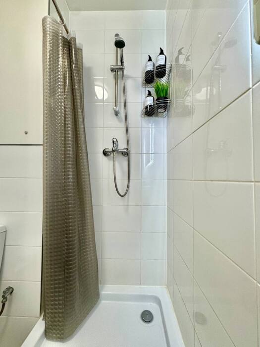 Ванная комната: душевая, стиральная машина, фен, стиральный порошок, средства для мытья посуды, средства гигиены: шампунь, гель для душа, бальзам, жидкое мыло в дозаторах, косметический набор, мицеллярная вода, ватные диски, ватные палочки, крем для рук, зубной набор, одноразовые тапочки.