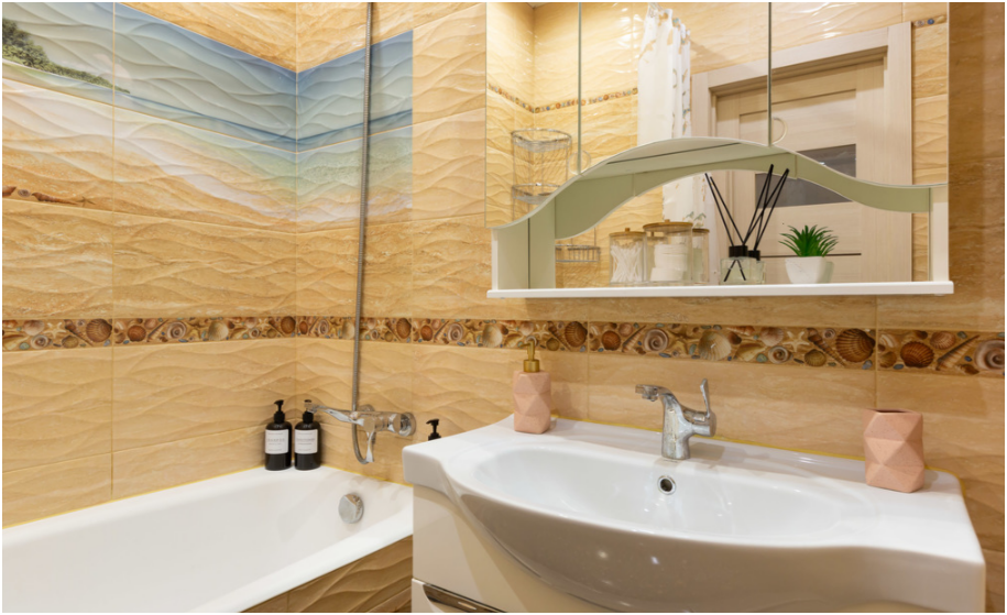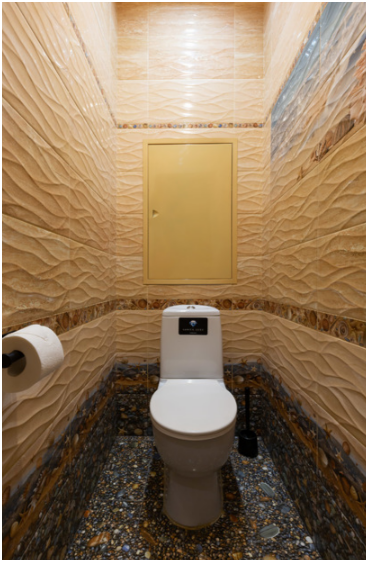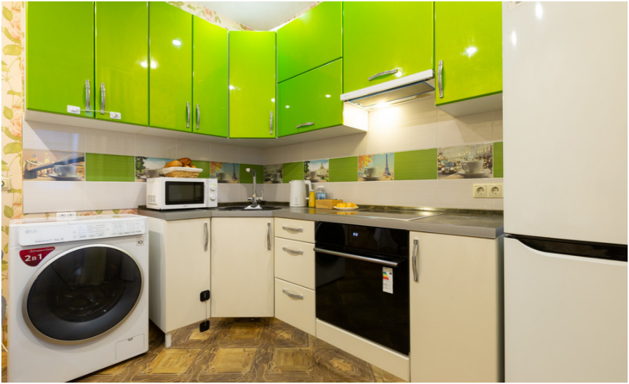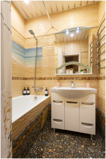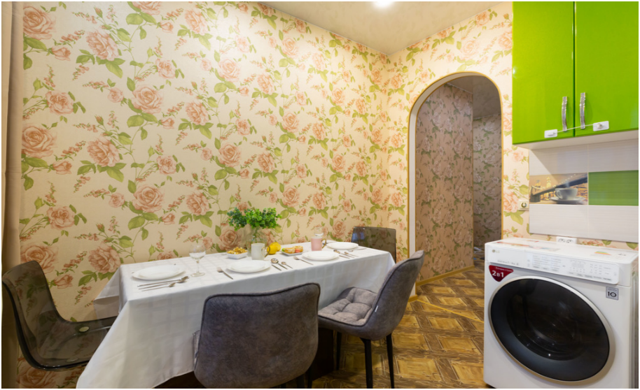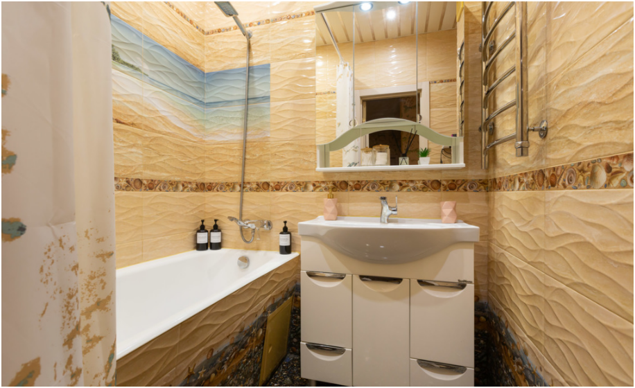 Ванная комната: ванна, стиральная машина, фен, стиральный порошок, средства для мытья посуды, средства гигиены: шампунь, гель для душа, бальзам, жидкое мыло в дозаторах, косметический набор, мицеллярная вода, ватные диски, ватные палочки, крем для рук, зубной набор, одноразовые тапочки.