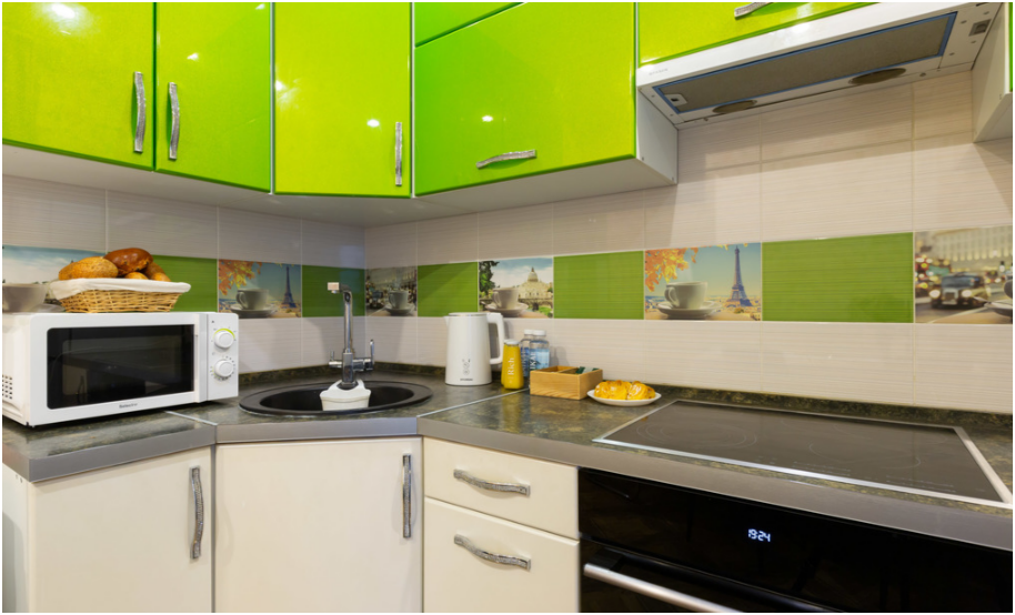 Кухня: плита, микроволновка, духовка, вытяжка, чайник, холодильник, мини-бар, набор посуды и все необходимые принадлежности для приготовления пищи, чай/кофе, соль, сахар, растительное масло, специи, минеральная вода.
