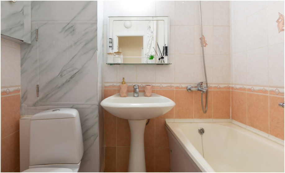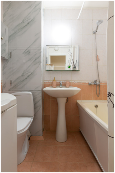 Ванная комната: ванна, стиральная машина, фен, стиральный порошок, средства для мытья посуды, средства гигиены: шампунь, гель для душа, бальзам, жидкое мыло в дозаторах, косметический набор, мицеллярная вода, ватные диски, ватные палочки, крем для рук, зубной набор, одноразовые тапочки.