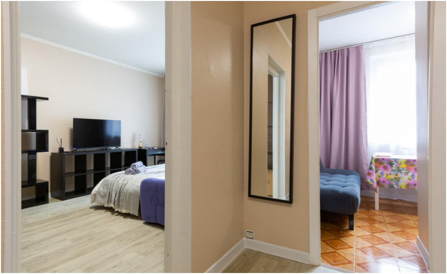 В квартире есть все необходимое для проживания 4-х человек: двуспальный диван - 2 шт. (160х200), плотные шторы портьеры блекаут для Вашего комфортного сна, вместительный шкаф для одежды, Wi-Fi, Smart TV, гладильная доска, утюг, сушилка, свежее качественное постельное белье, комплект мягких полотенец.