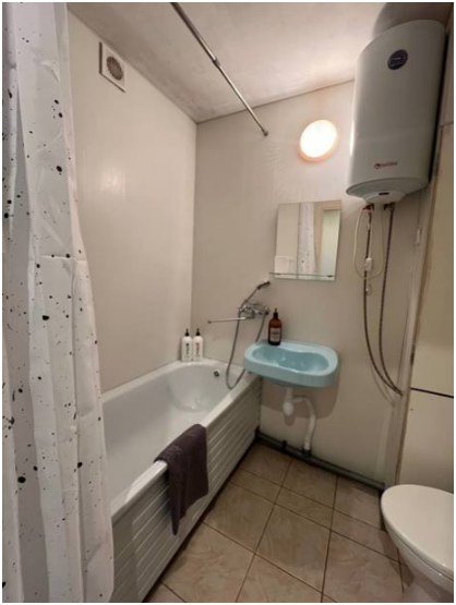 Ванная комната: ванна, стиральная машина, фен, стиральный порошок, средства для мытья посуды, средства гигиены: шампунь, гель для душа, бальзам, жидкое мыло в дозаторах, косметический набор, мицеллярная вода, ватные диски, ватные палочки, крем для рук, зубной набор, одноразовые тапочки.